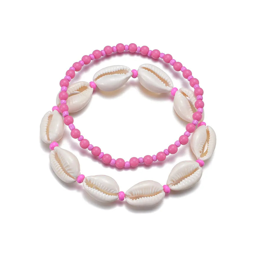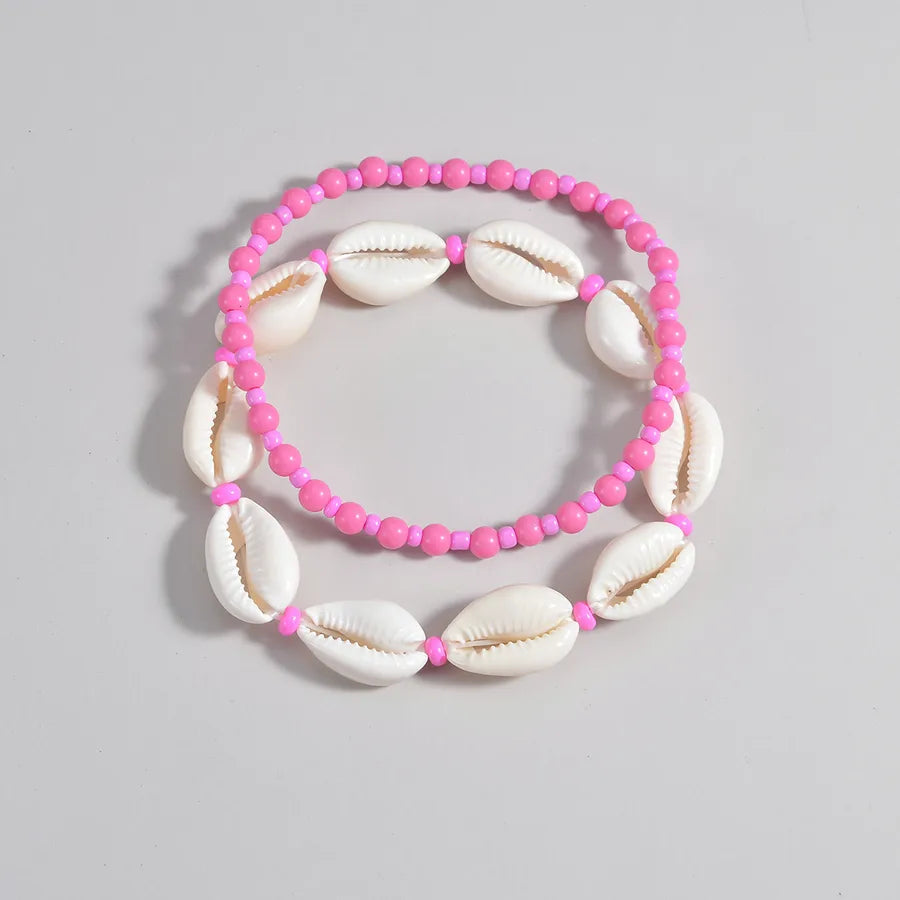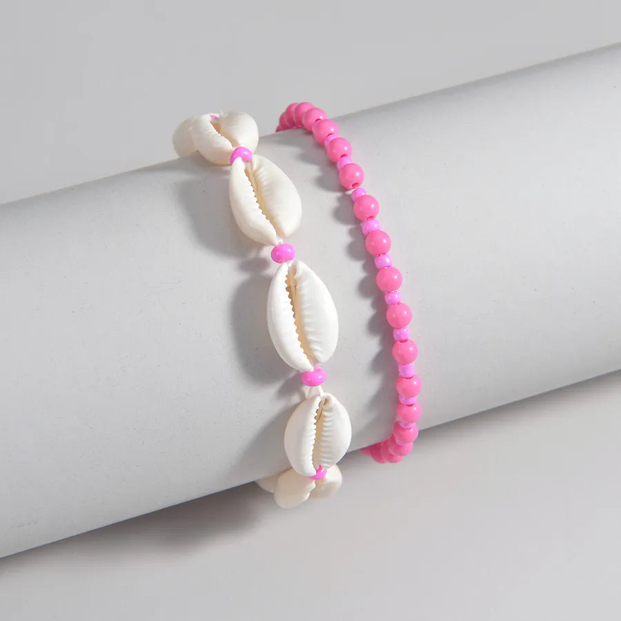 Bohemian Ocean Style Y2K Pink Shell Elastic Ankle Bracelets 2pcs Set Suitable For Ladies And Girls Vacation Geometric Pattern - XY-3863