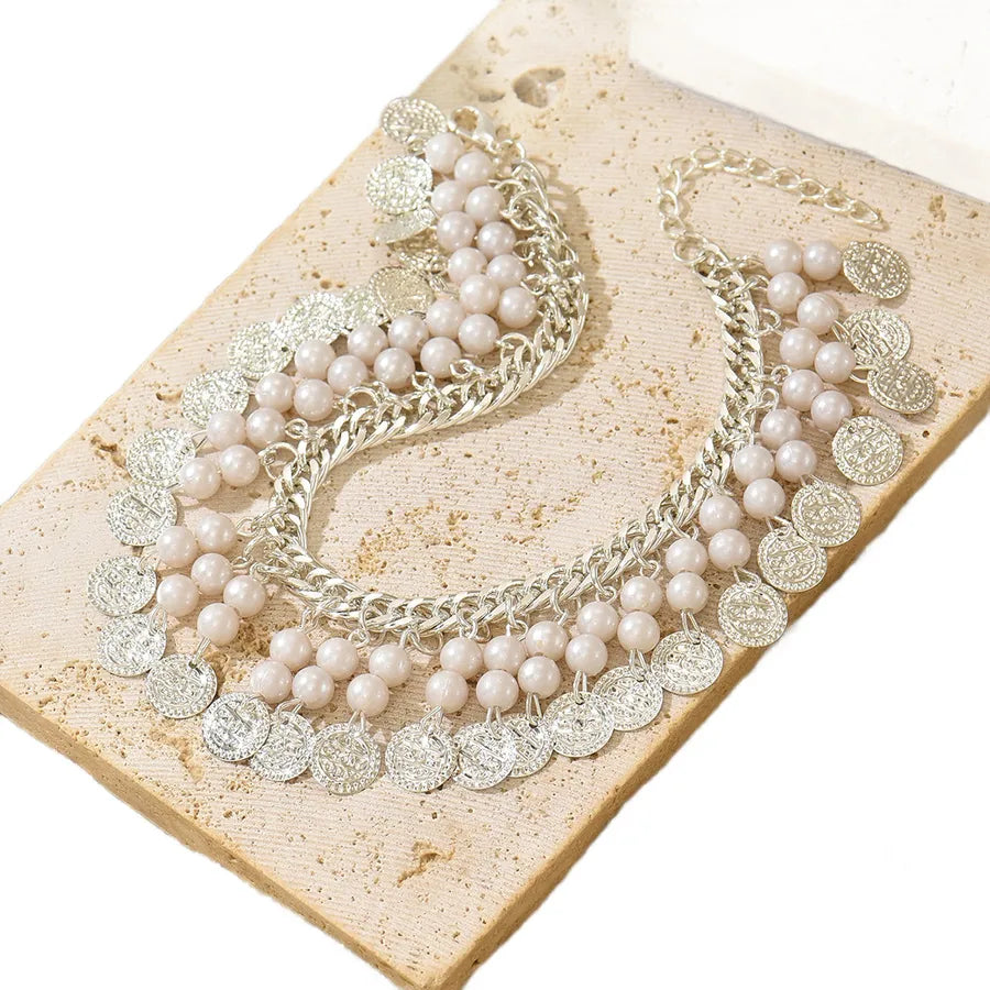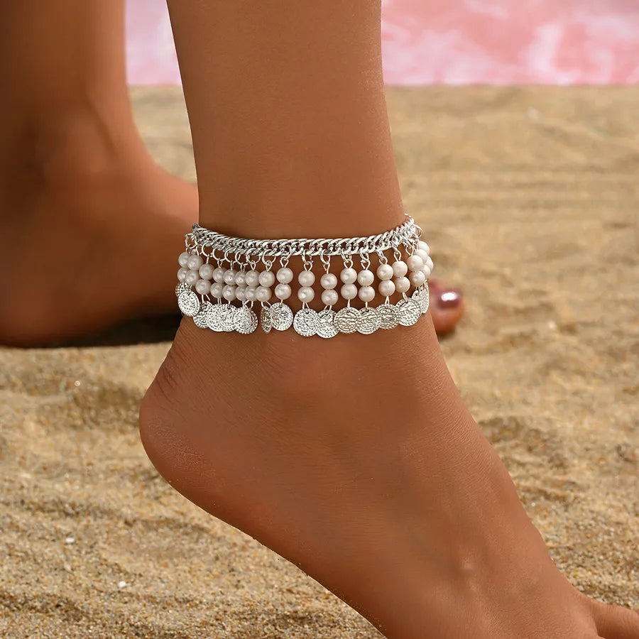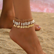 Bohemian Style Geometric Imitation Pearl Ancient Coin Pendant Tassel Ankle Chain Beach Sandal Foot Jewelry For Women - AF844 Gold