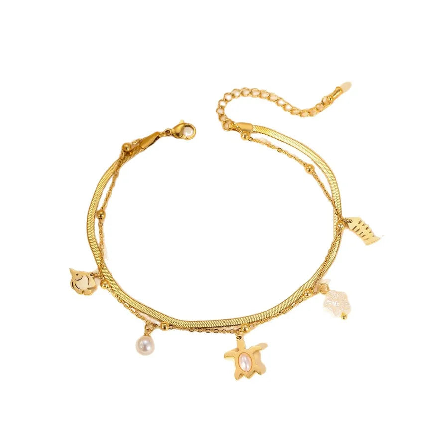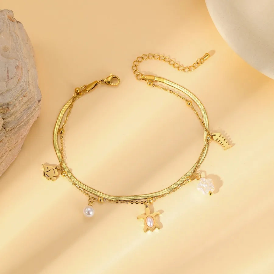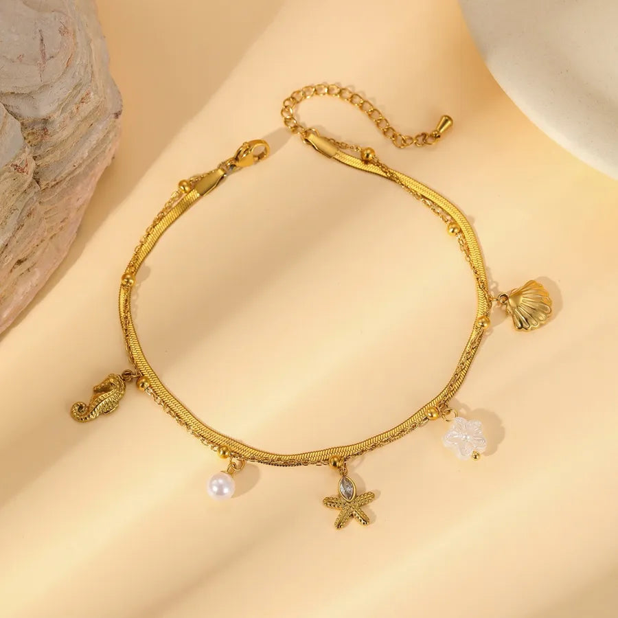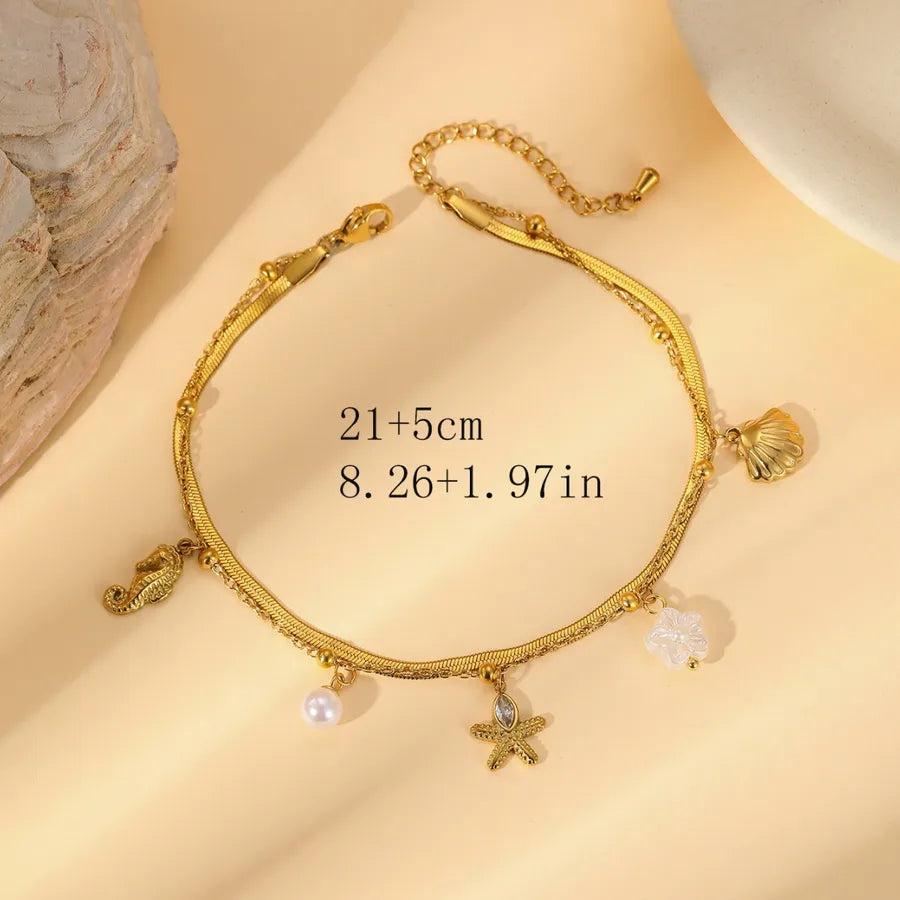 Double Layer Shell Bead Ankle Chain Women's Starfish Animal String Stainless Steel Geometric Pattern Wedding Simple Style Unisex - Style 1 / 18k
