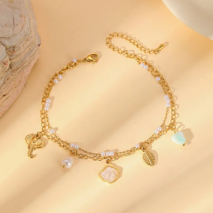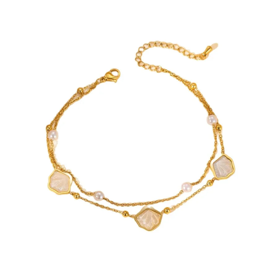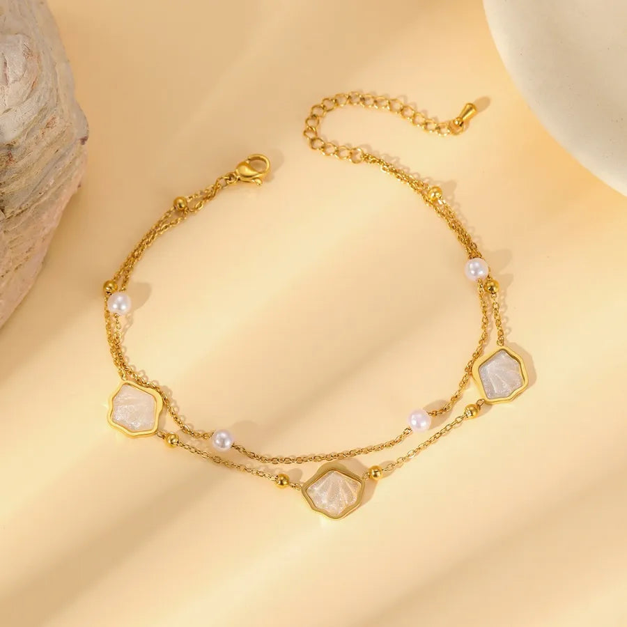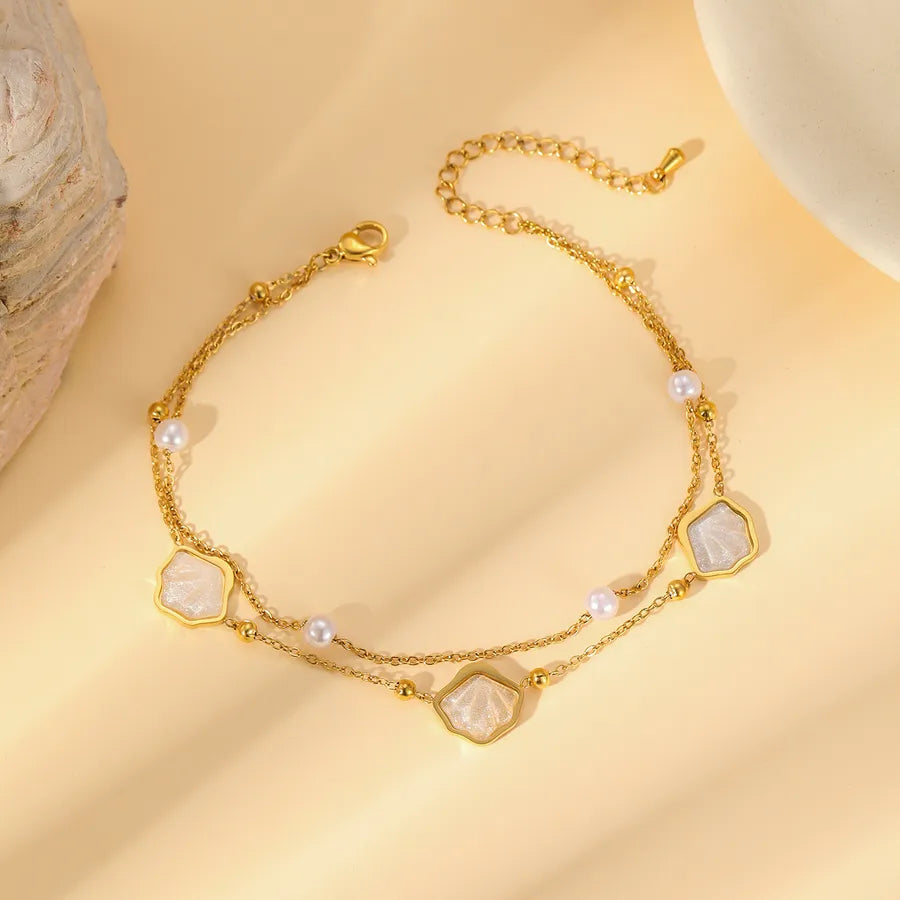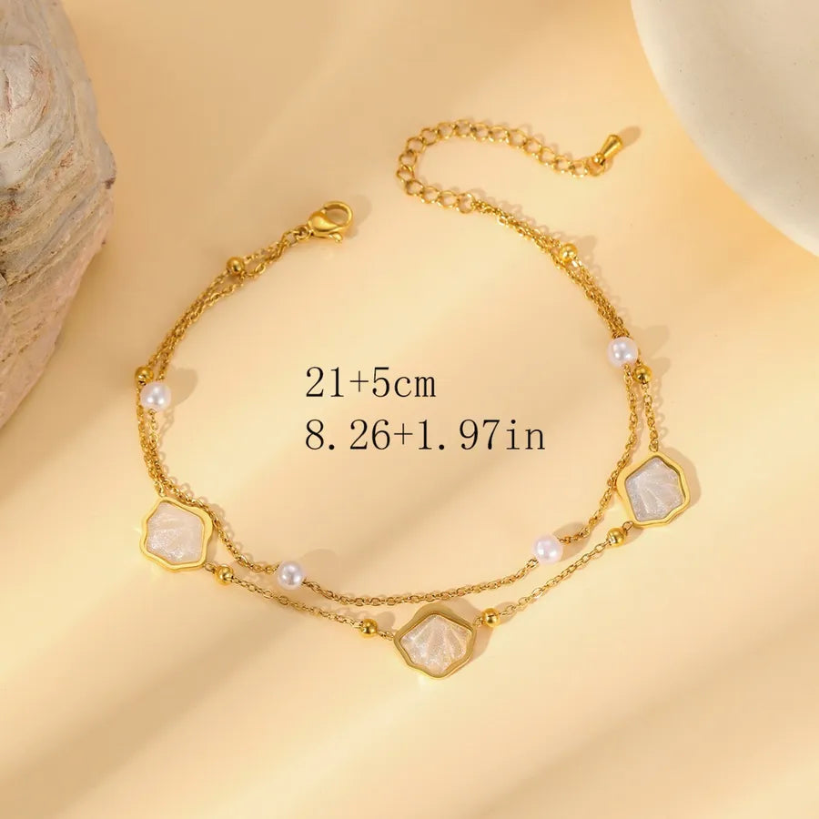New Style Simple Shell Embedded Diamond Stainless Steel Plated Gold Imitation Pearl Ankle Bracelet Fresh Jewelry Unisex - Style 1 / 18k