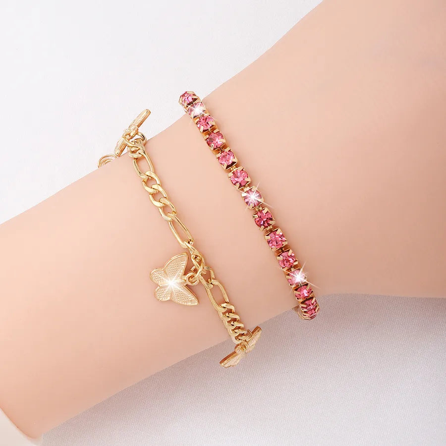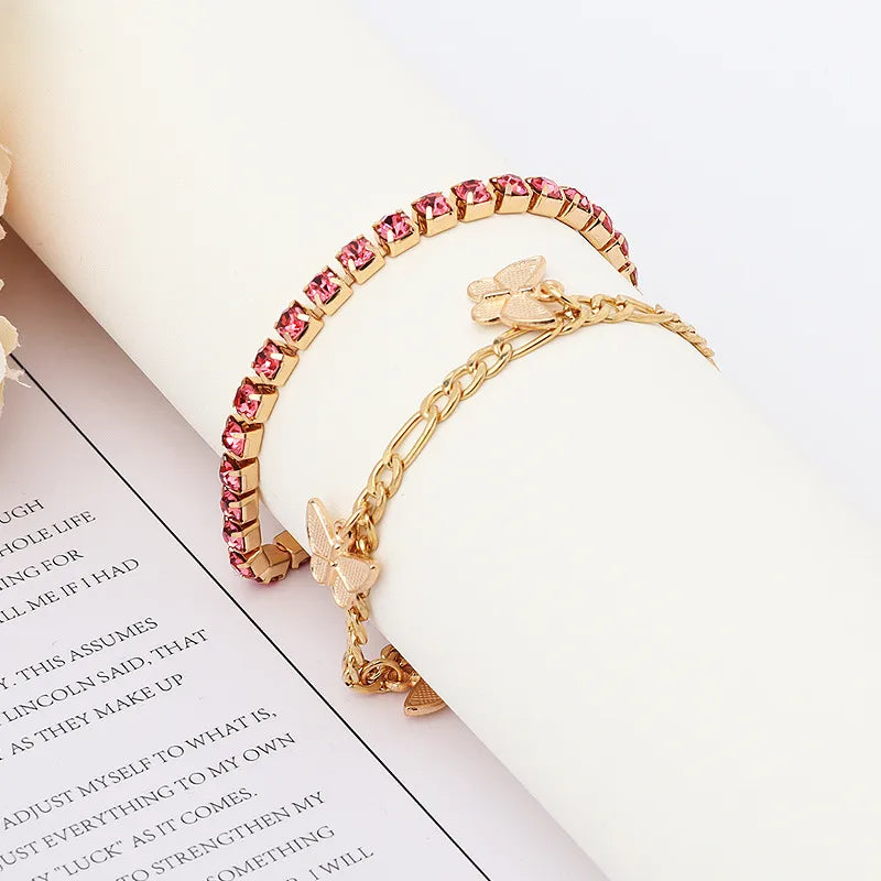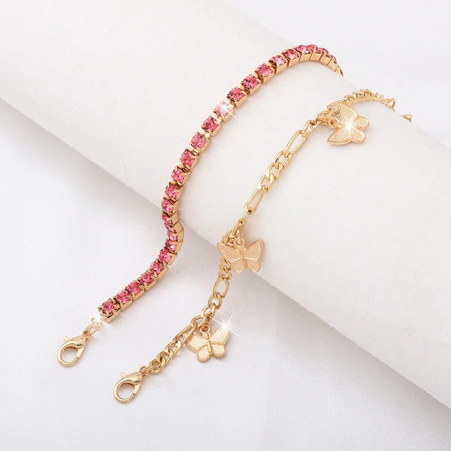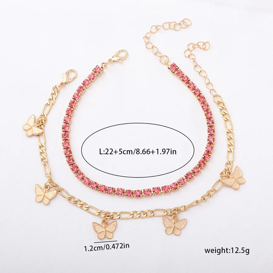 Pink Butterfly Tassel Copper Decor Multi-Layer Two-Piece Set Ankle Bracelets Simple Sweet Style Wedding - Gold MS8103
