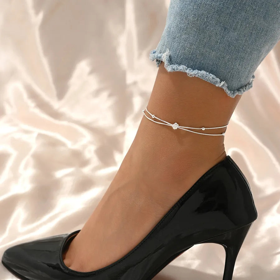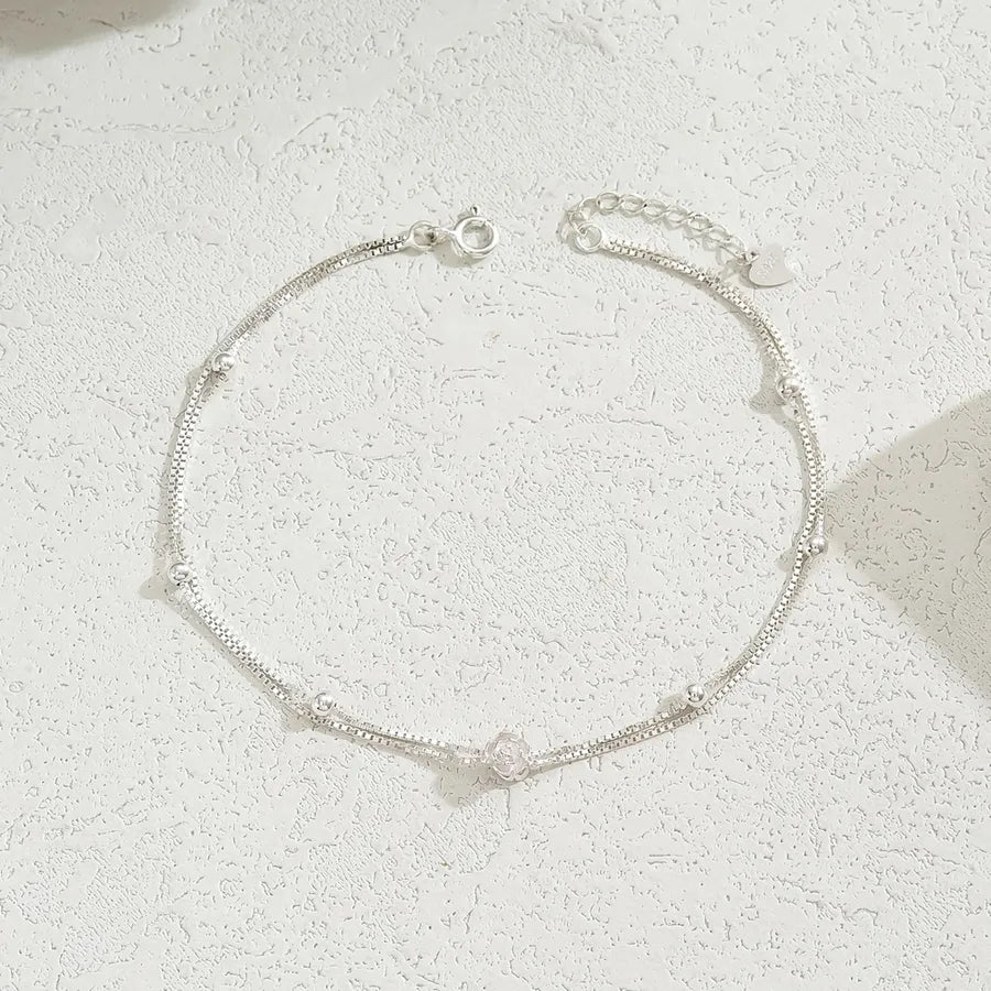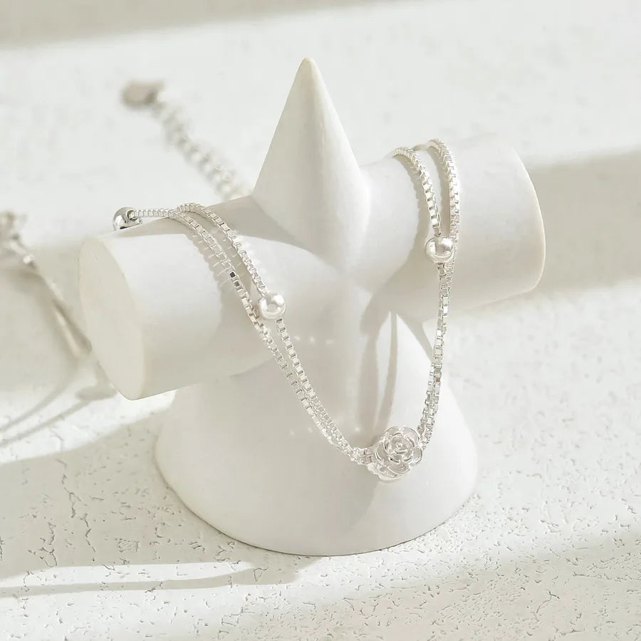 Romantic Double Layered 925 Silver Rose Flower Women's Ankle Bracelet New Design Casual Elegant Cute Summer Wedding Gift - Average Size / Silver