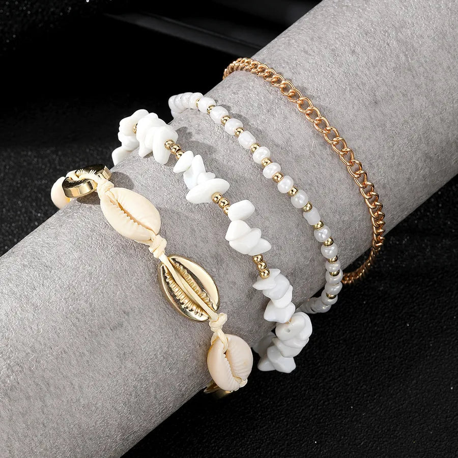 Bohemian style conch rice bead chain anklet 4-piece white small gravel beach shell bead woven anklet