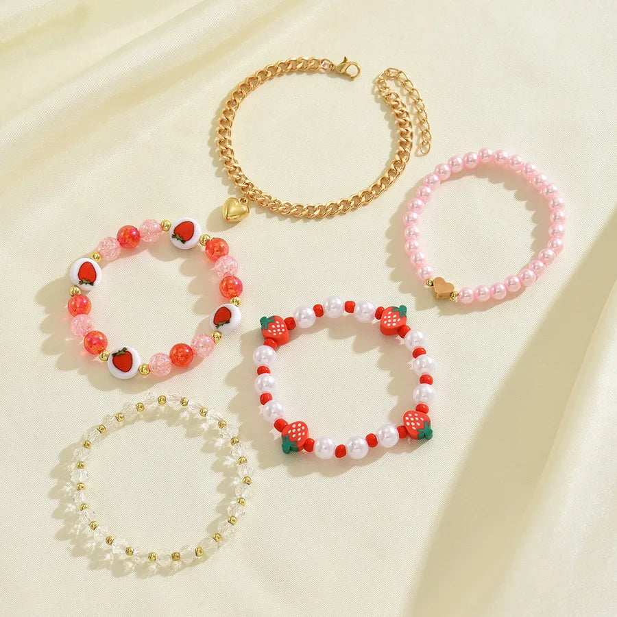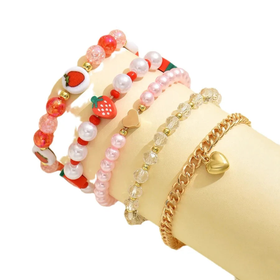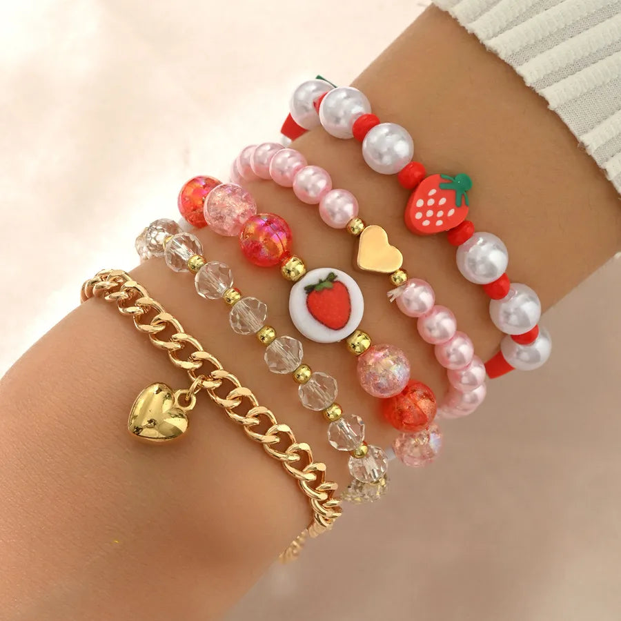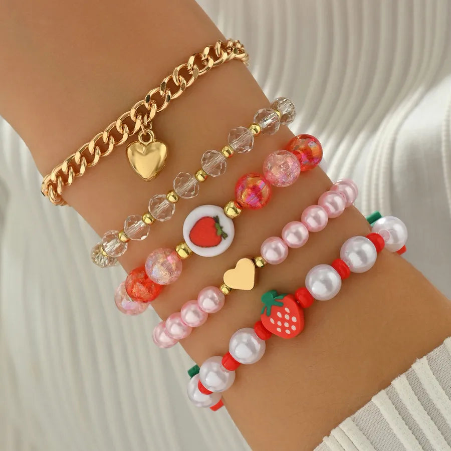 Cute Red Strawberry Imitation Pearl Soft Clay Bracelet Set Heart Pendant Women's Adorable Fruit Pattern Jewelry Accessories - BM0232