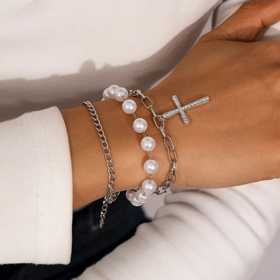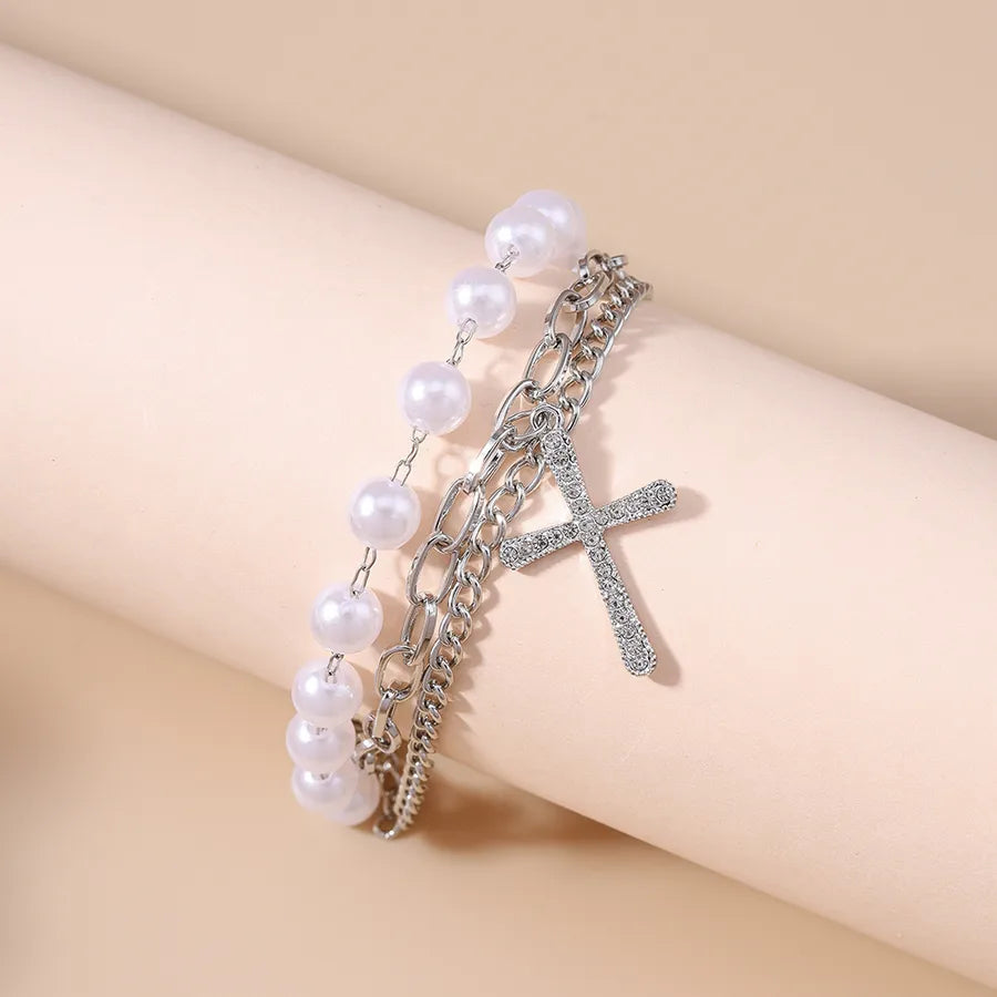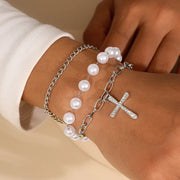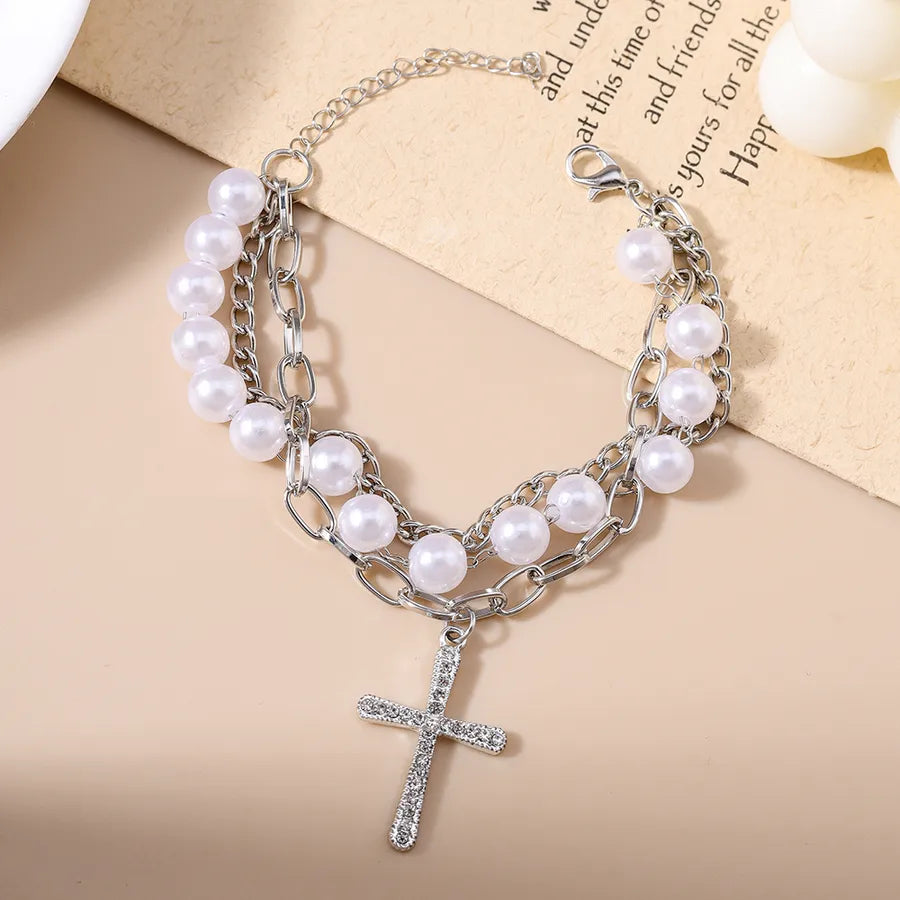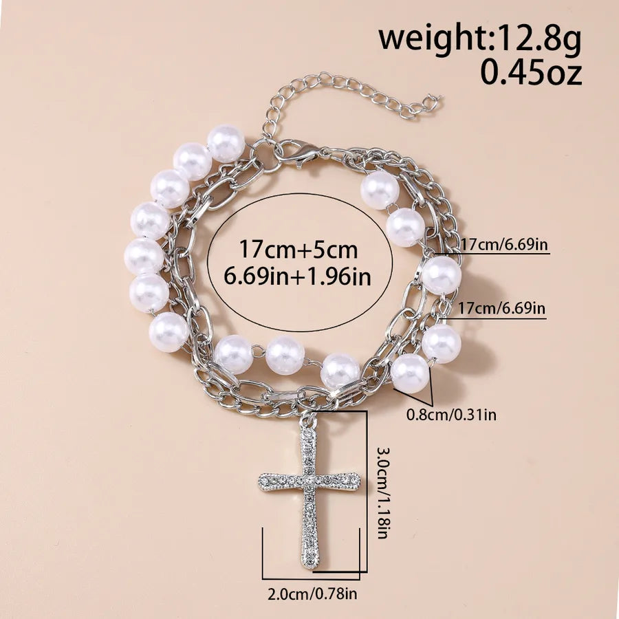 Elegant Religion Punk Cross Artificial Pearl Alloy Handmade Chain Lobster Trigger Clasp Closure Chain & Link Bracelets Wholesale - Average Size / Silver / Double-Layer Bracelet