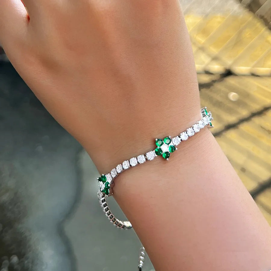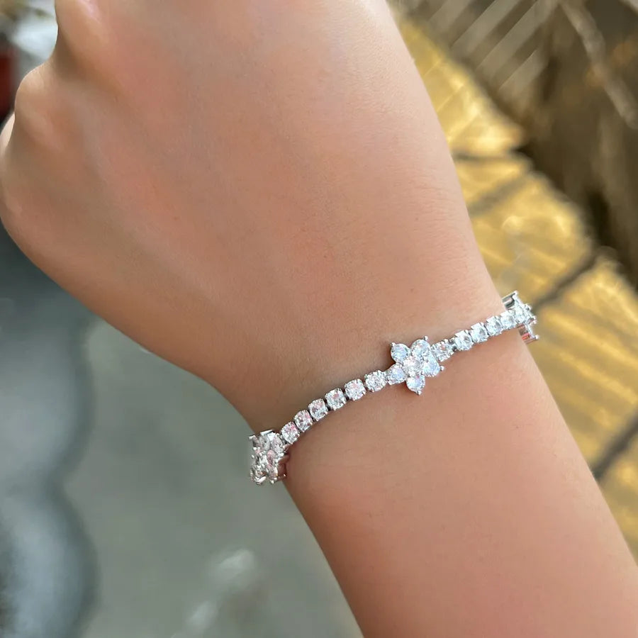 ig style elegant wedding flower copper plating inlay artificial gemstones 14k gold plated rhodium plated tennis bracelet - White