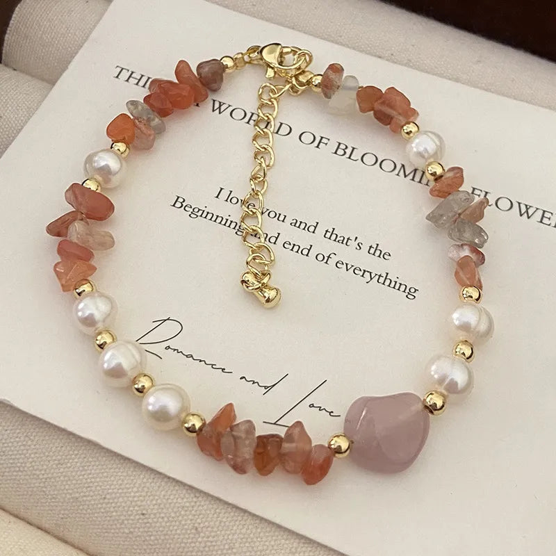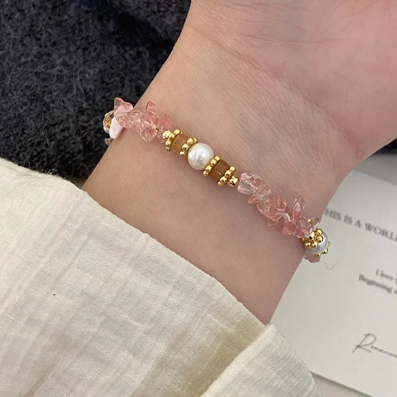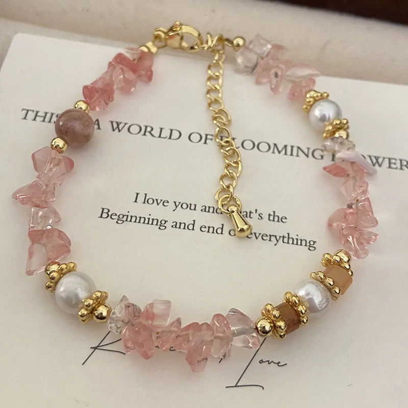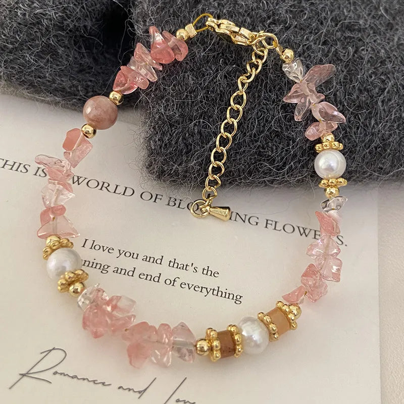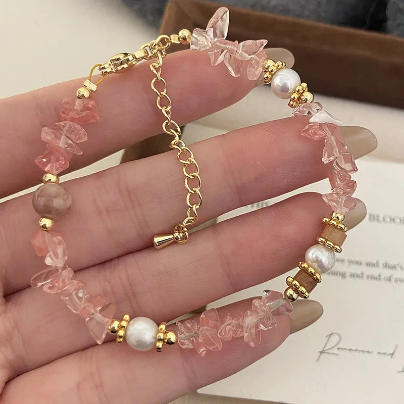 Pink Natural Strawberry Crystal Hand Bracelet Fresh Peach Blossom Attracting Freshwater Pearl Hand Chain Sweet Super Fairy Natural Stone Jewelry - R0748 Natural Stone Bracelet
