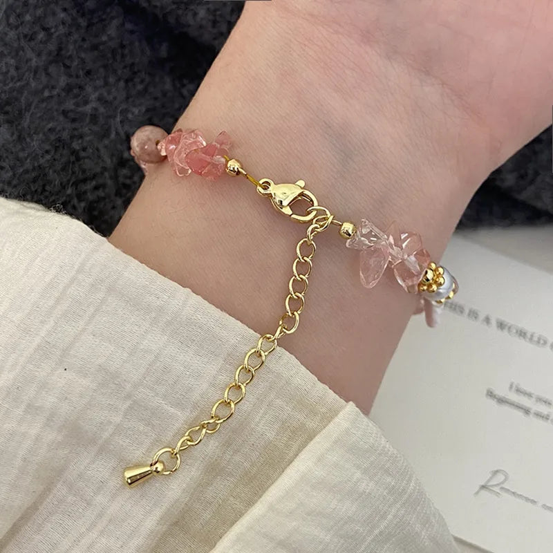 Pink Natural Strawberry Crystal Hand Bracelet Fresh Peach Blossom Attracting Freshwater Pearl Hand Chain Sweet Super Fairy Natural Stone Jewelry