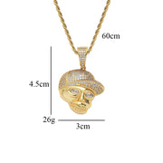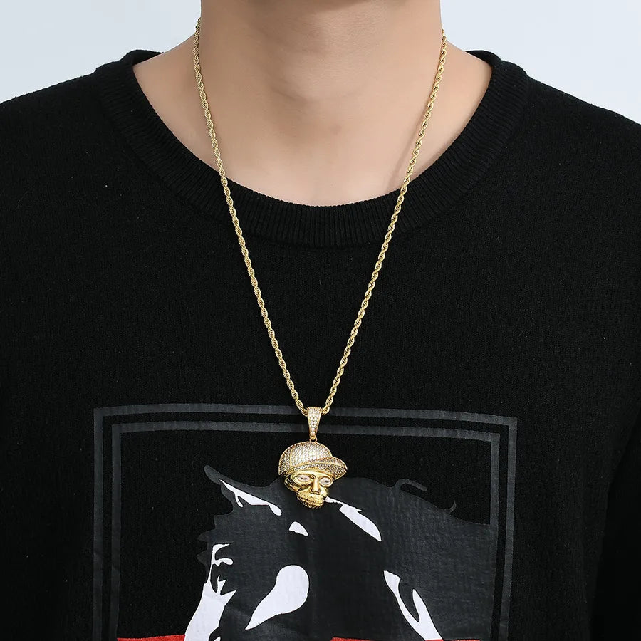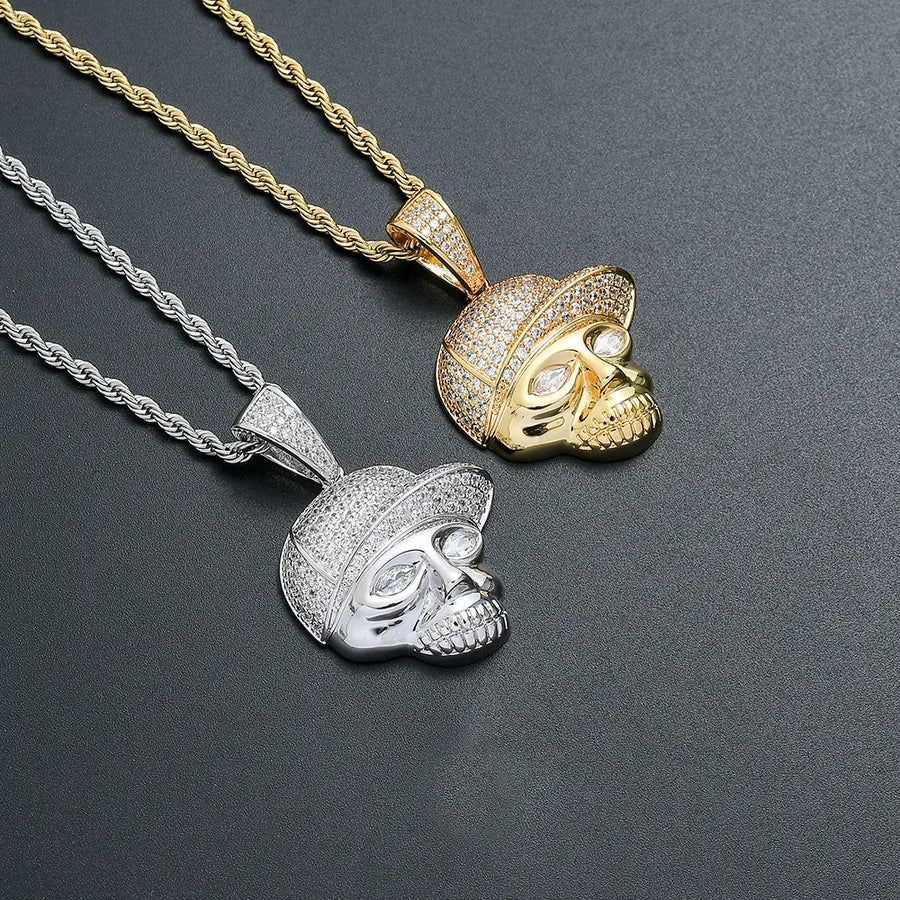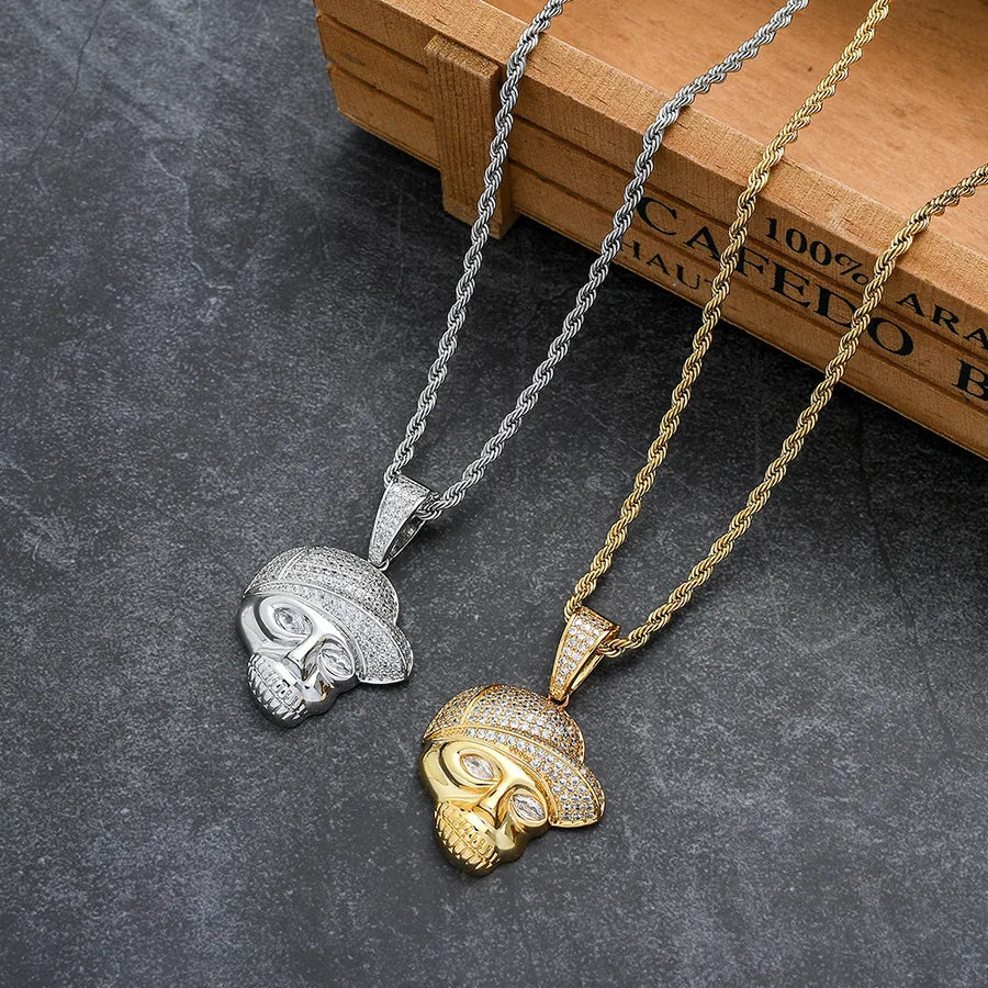Copper Skull Pendant With Hat Halloween Themed Zircon Inlay Hip Hop Style Cartoon And Devil Design Clavicle Chain Pendant - Gold+3mm 24inch Gold Twist Chain