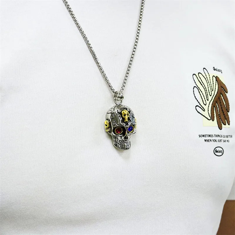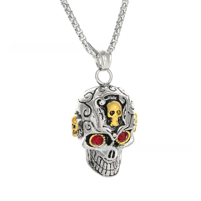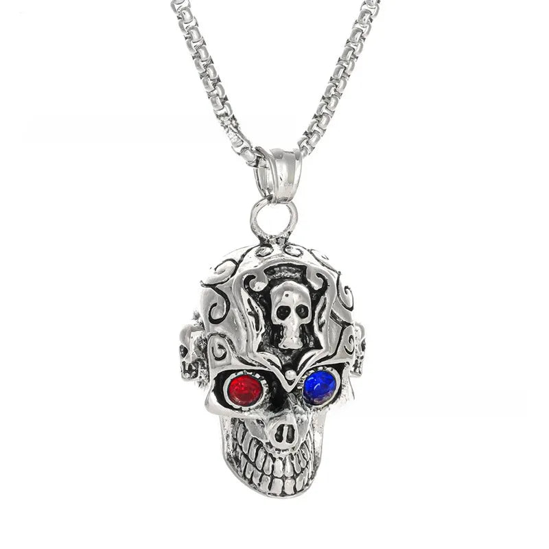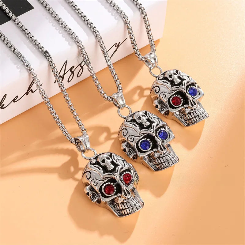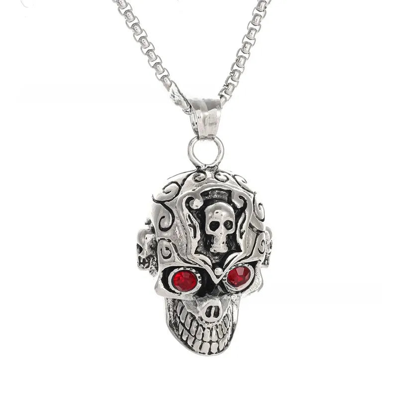 Trendy Halloween Titanium Steel Skull Head Necklace Vintage Men's Hip Hop Alloy Pendant Unisex Personalized Jewelry - Ancient Silver-Red Eye