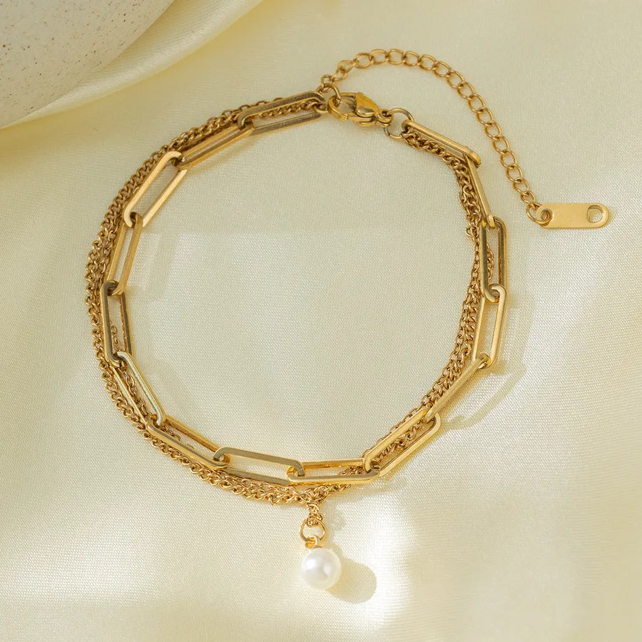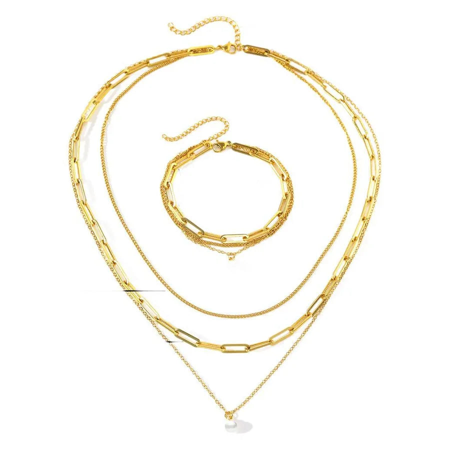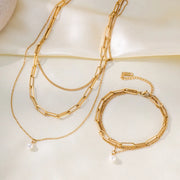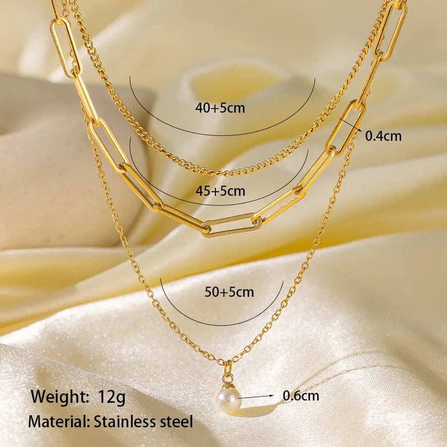 Casual Simple Style Commute Geometric 304 Stainless Steel Plastic Polishing Plating 18K Gold Plated Women's cable chain Bracelets Necklace - Qyh1038 Three-Layer Chain Pearl
