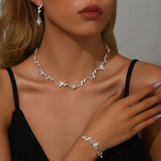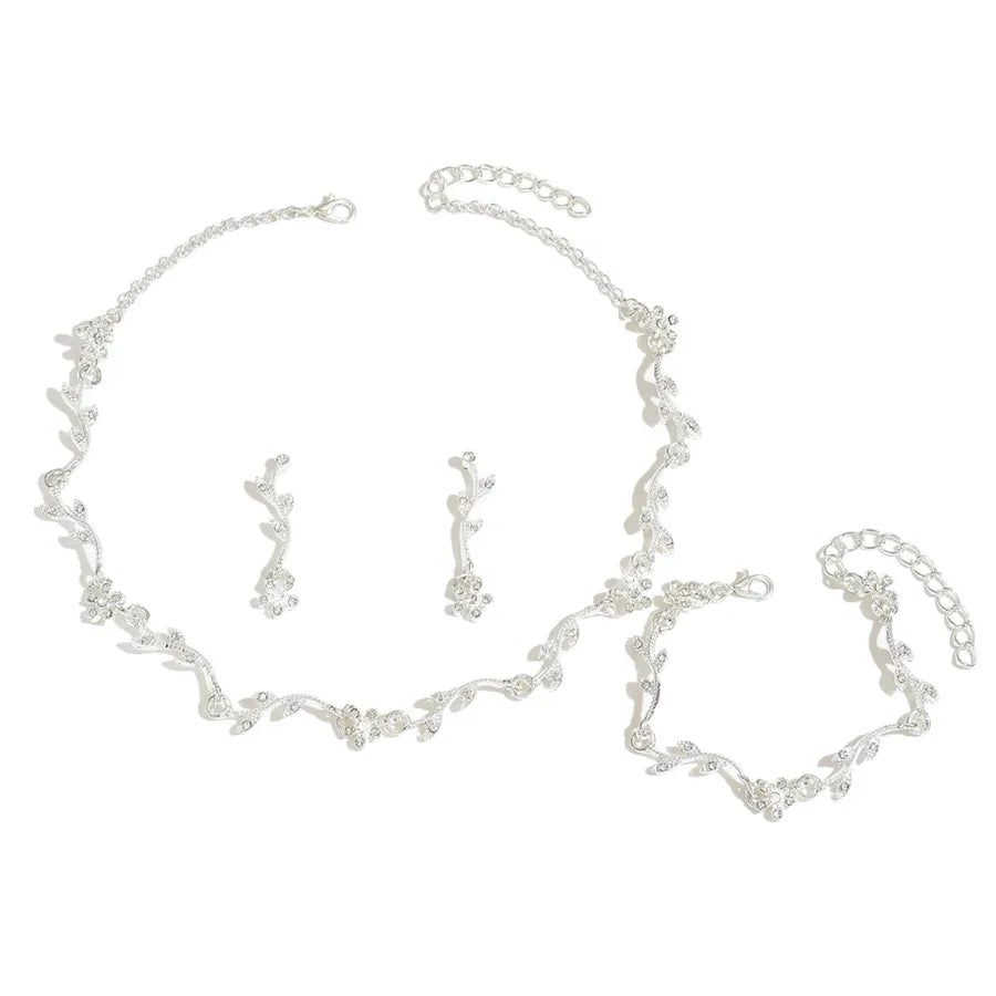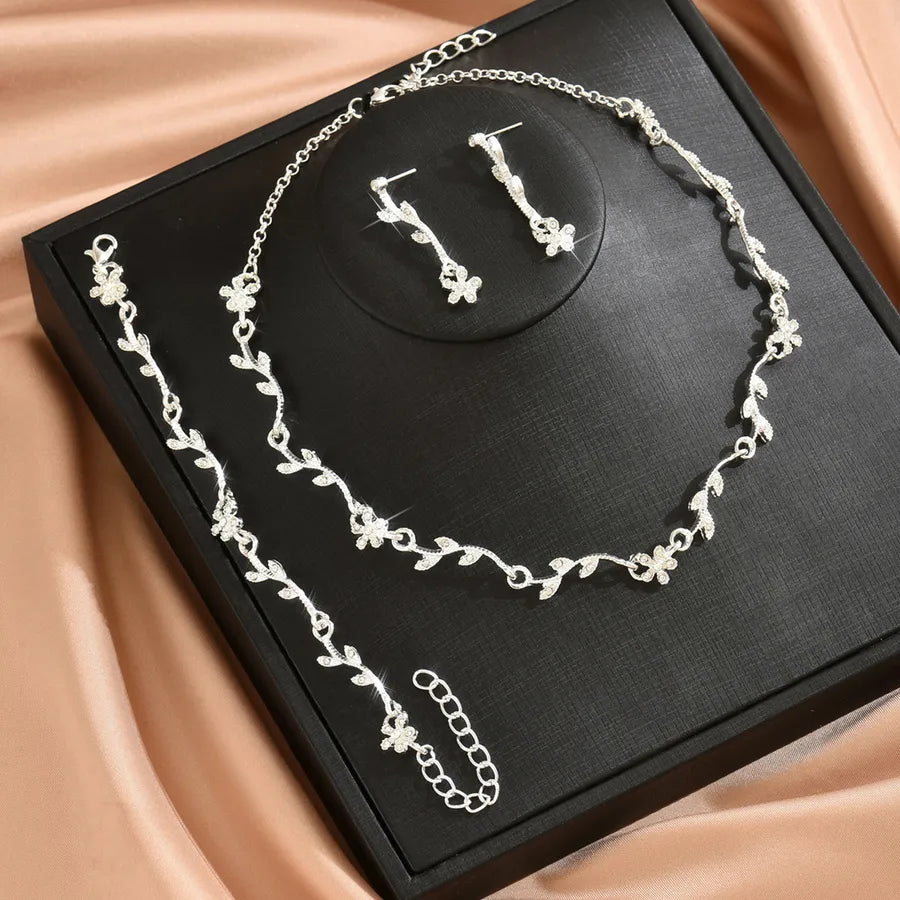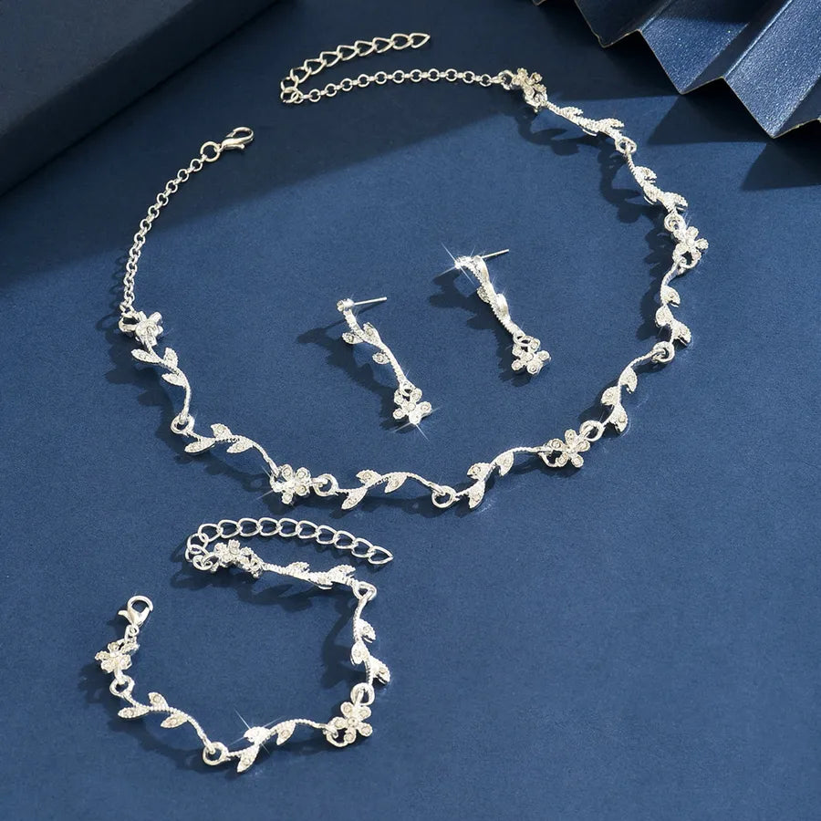New Style Floral Diamond Embedded Jewelry Set Simple Elegance Necklace Earrings Bracelet Three-Piece Accessory Ensemble - 80860701 Silver Three-piece Set