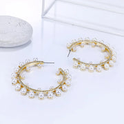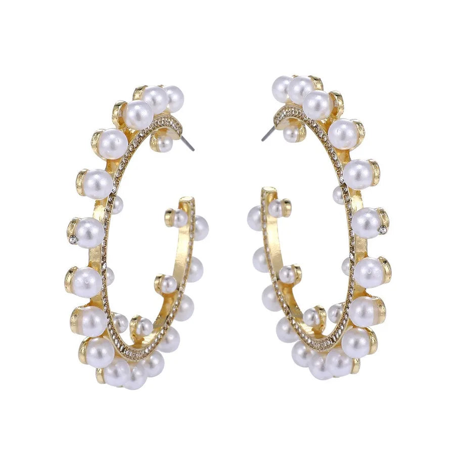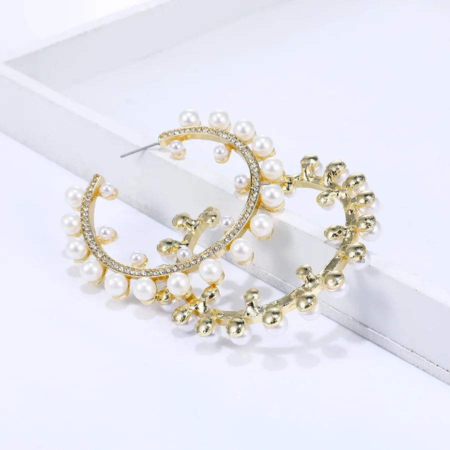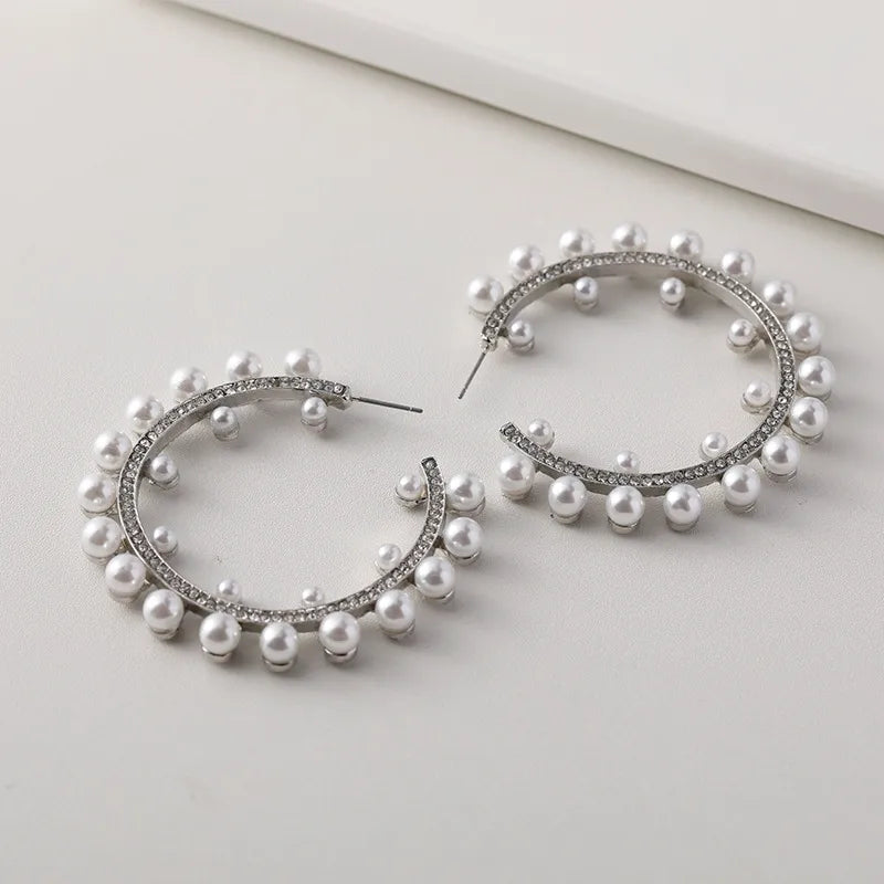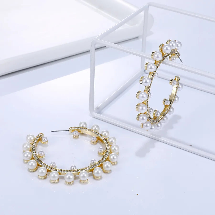 Exaggerated Large Circle Pearl Diamond Embedded Fashion Trend Simple Personality Hoop Earrings Women - White