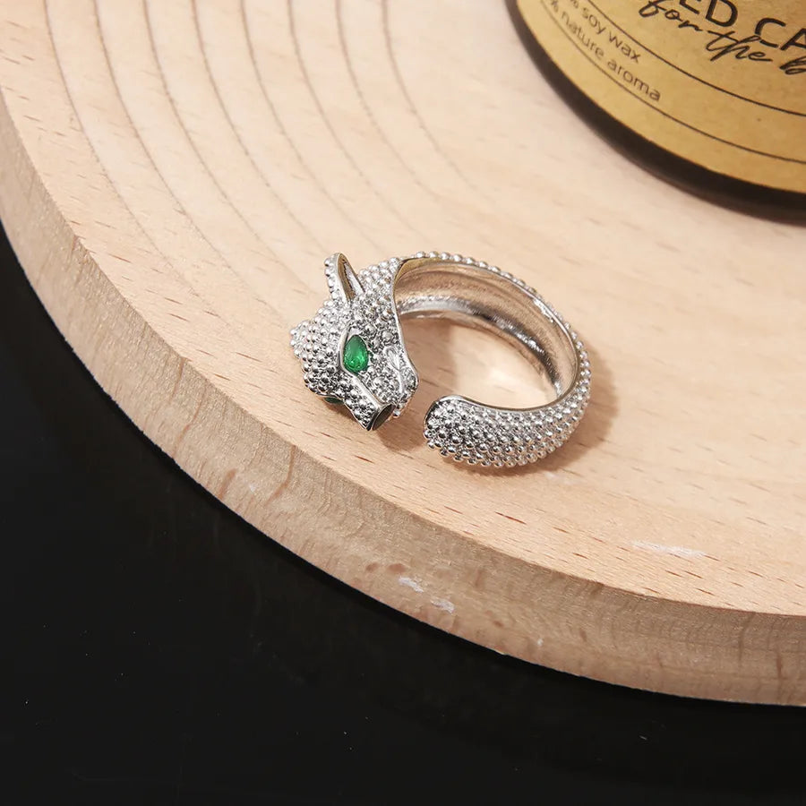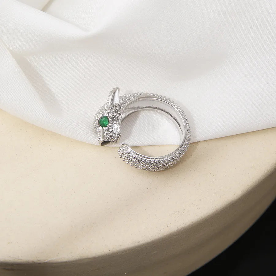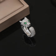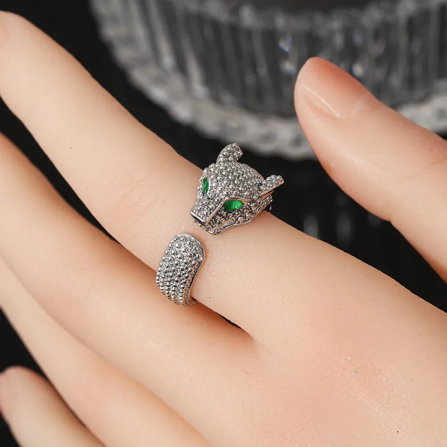 Fashionable European Open Hand Ring With Embedded Diamond Leopard Head Design Unisex Animal Zodiac Pattern Zinc Alloy Jewelry - Average Size / Silver
