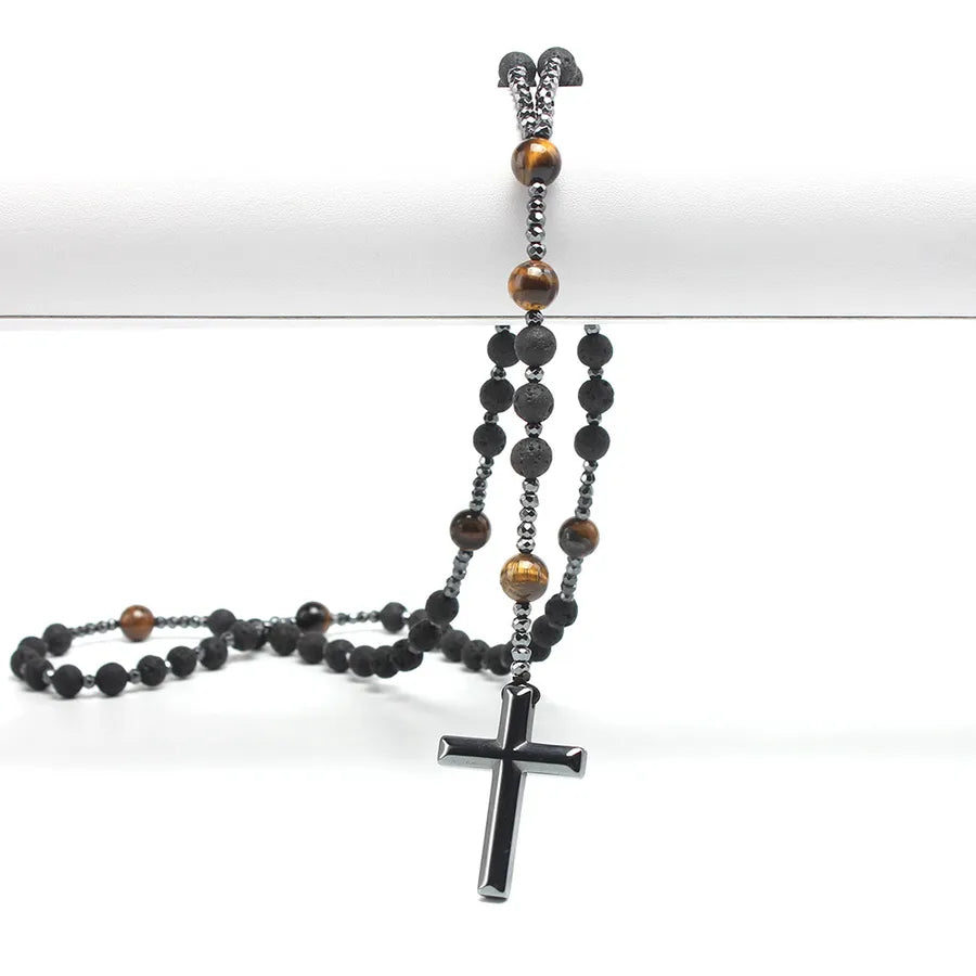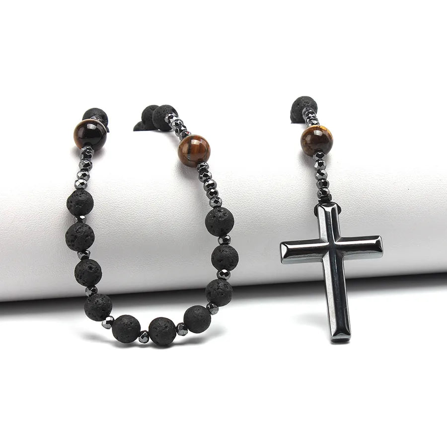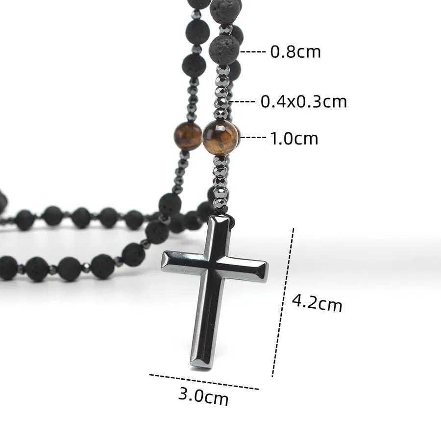 Chinoiserie Retro Ethnic Style Cross natural stone Beaded Men's Pendant Necklace - Haematite Cross Pendant (Volcanic Rock No. 1)