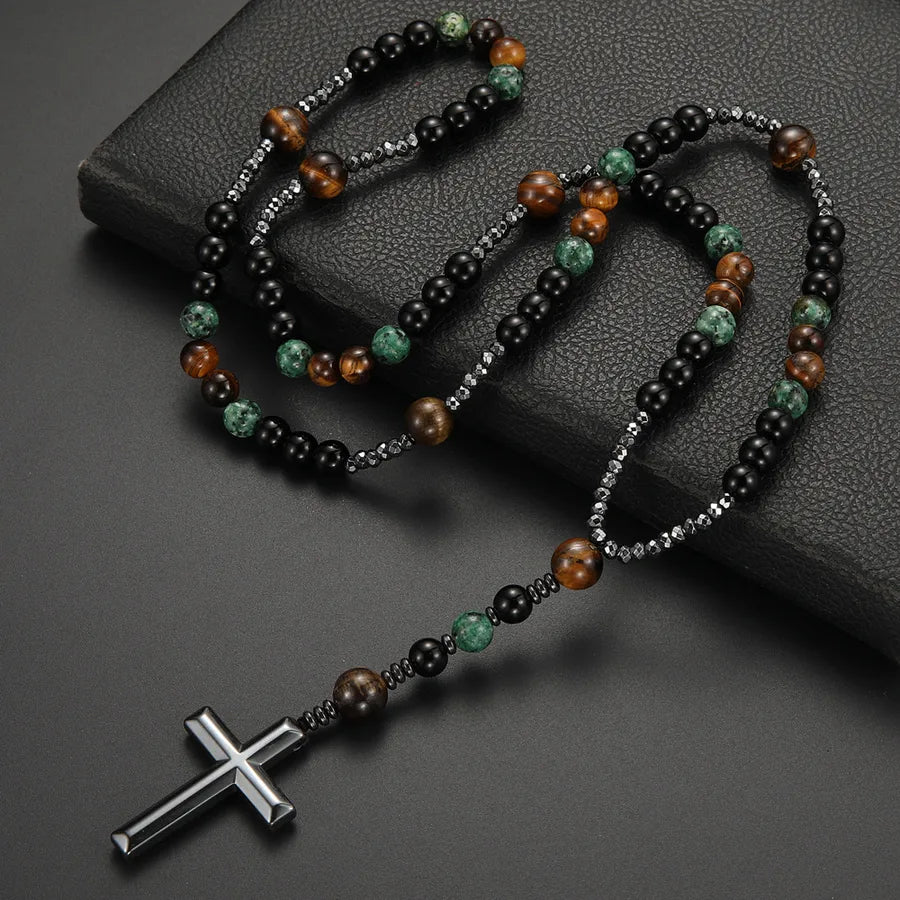 Chinoiserie Retro Ethnic Style Geometric Cross natural stone Beaded Polishing Men's Pendant Necklace