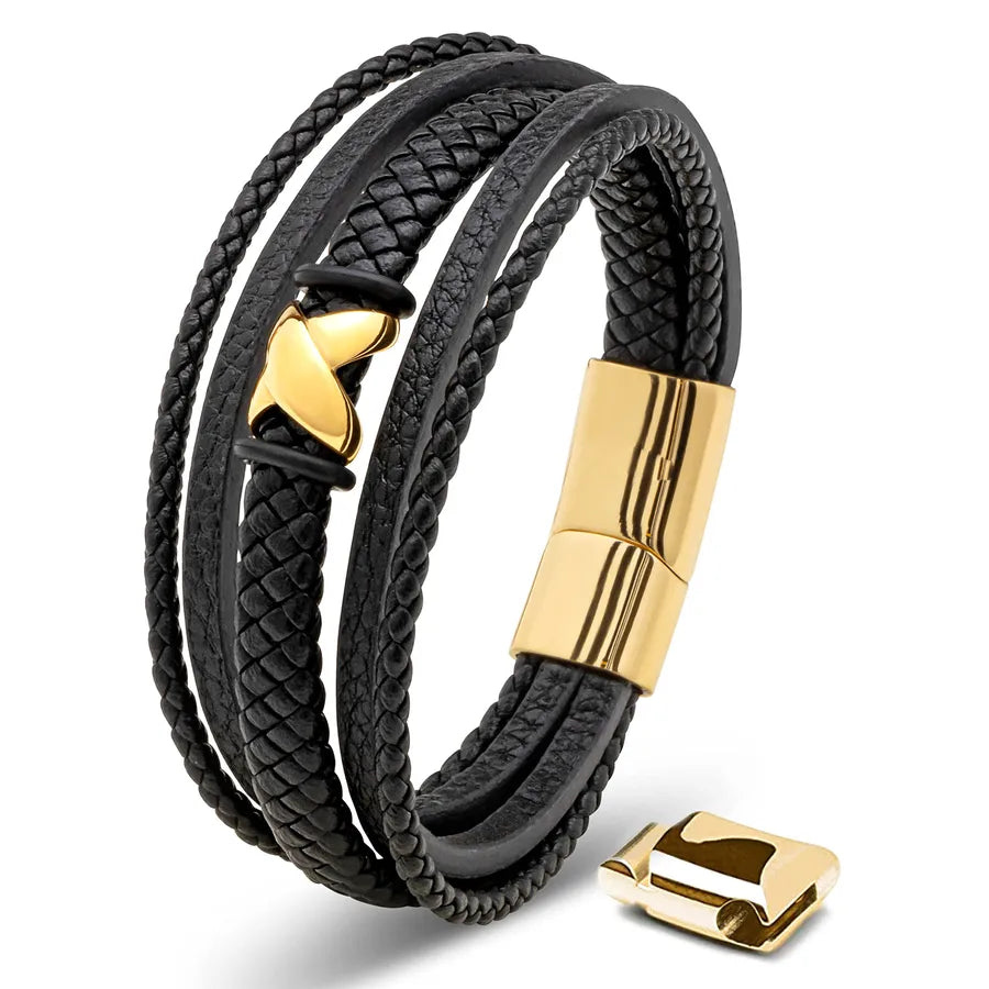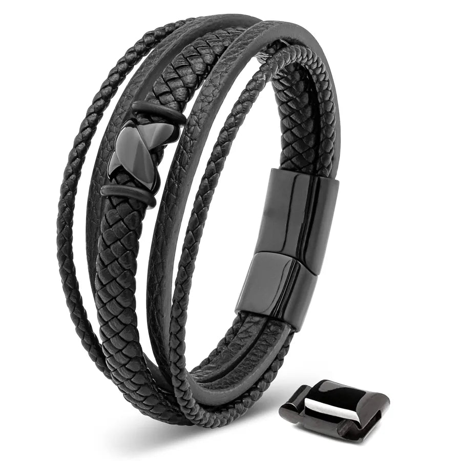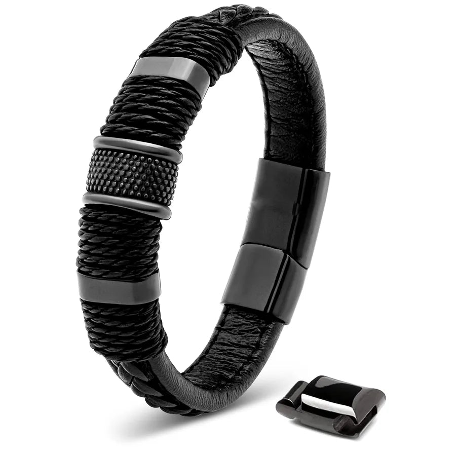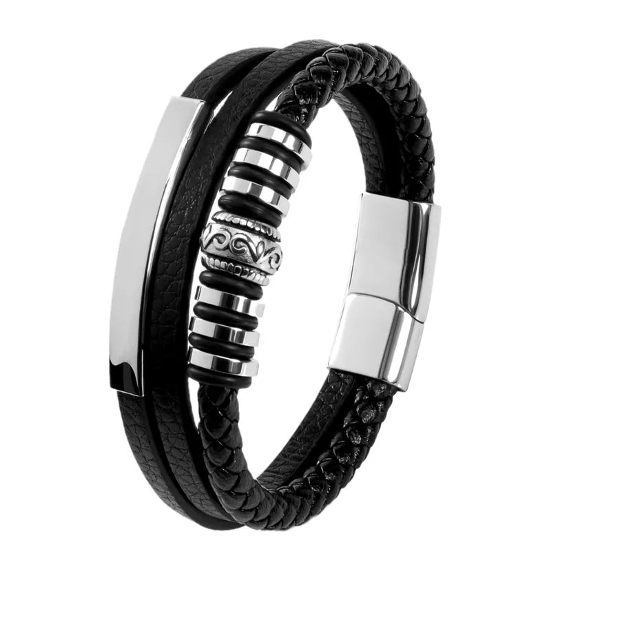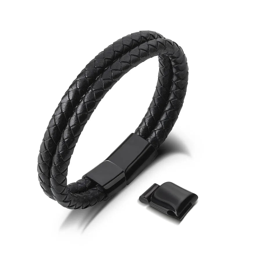 Leather Bracelet Men's Stainless Steel Three-Section Buckle Black and Golden Electroplated Magnetic Buckle Steel Ball Elbow Lettering Leather Bracelet - Three-Layer Elbow Steel Ball-Three-Section Buckle Steel Color