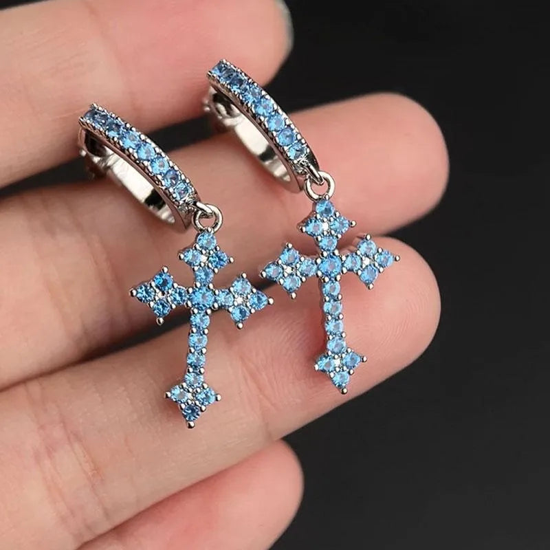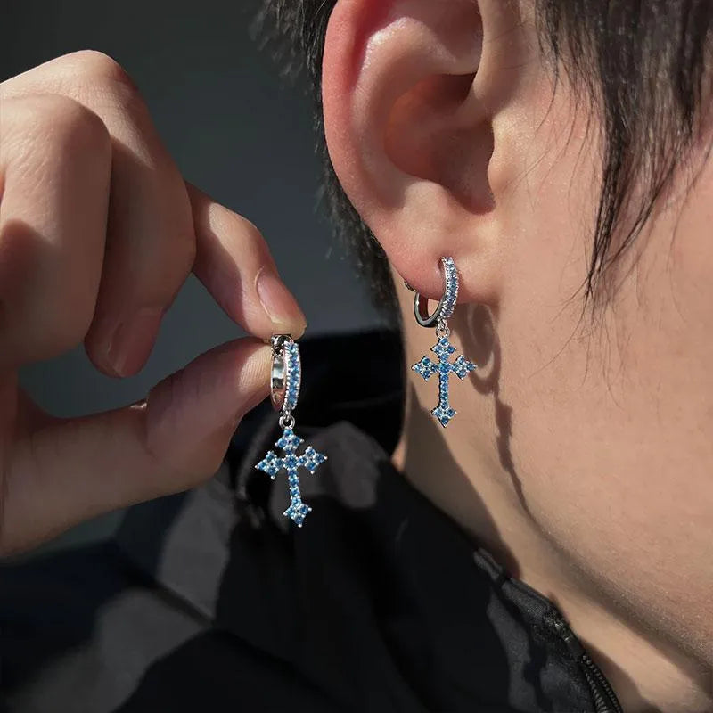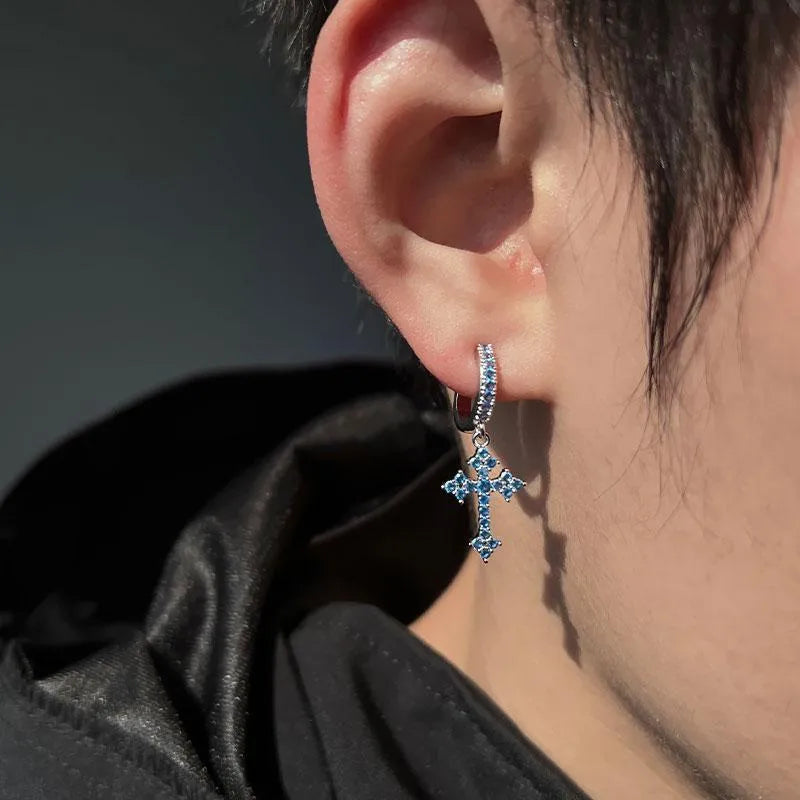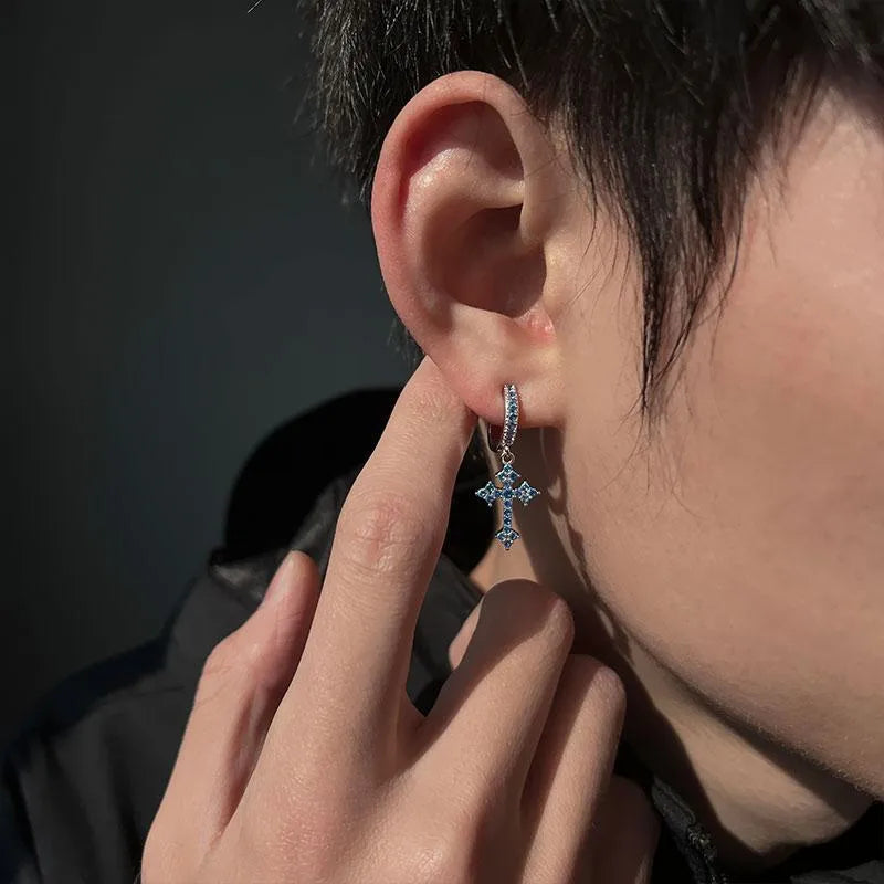 Blue Diamond Cross Men's Earrings Fashion All-match Distinctive Earrings Ins Hip-hop Trend - 【No Pierced Ears】Single Cross Ear Clip