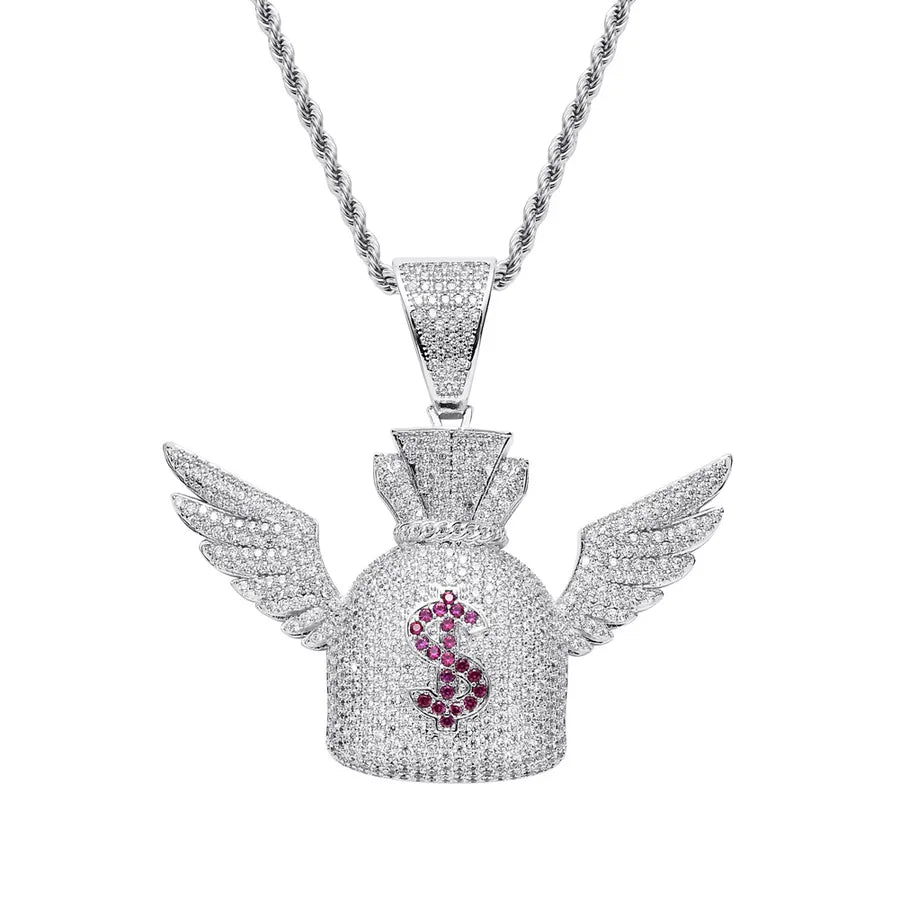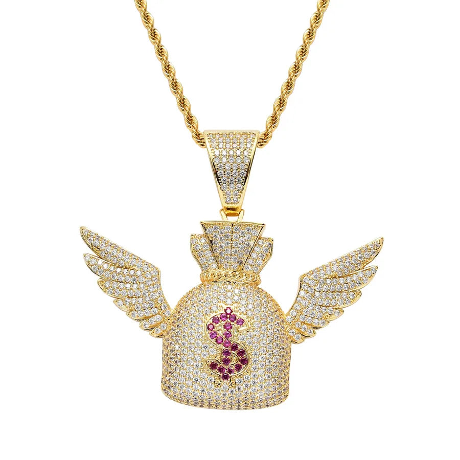 Angel Wings Money Bag Pendant Necklace Hip Hop Jewelry Rap Accessory Dollar Symbol Coin And Zirconia Crafted Geometric Pattern - Gold (without Chain)