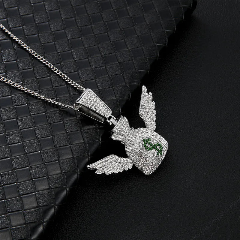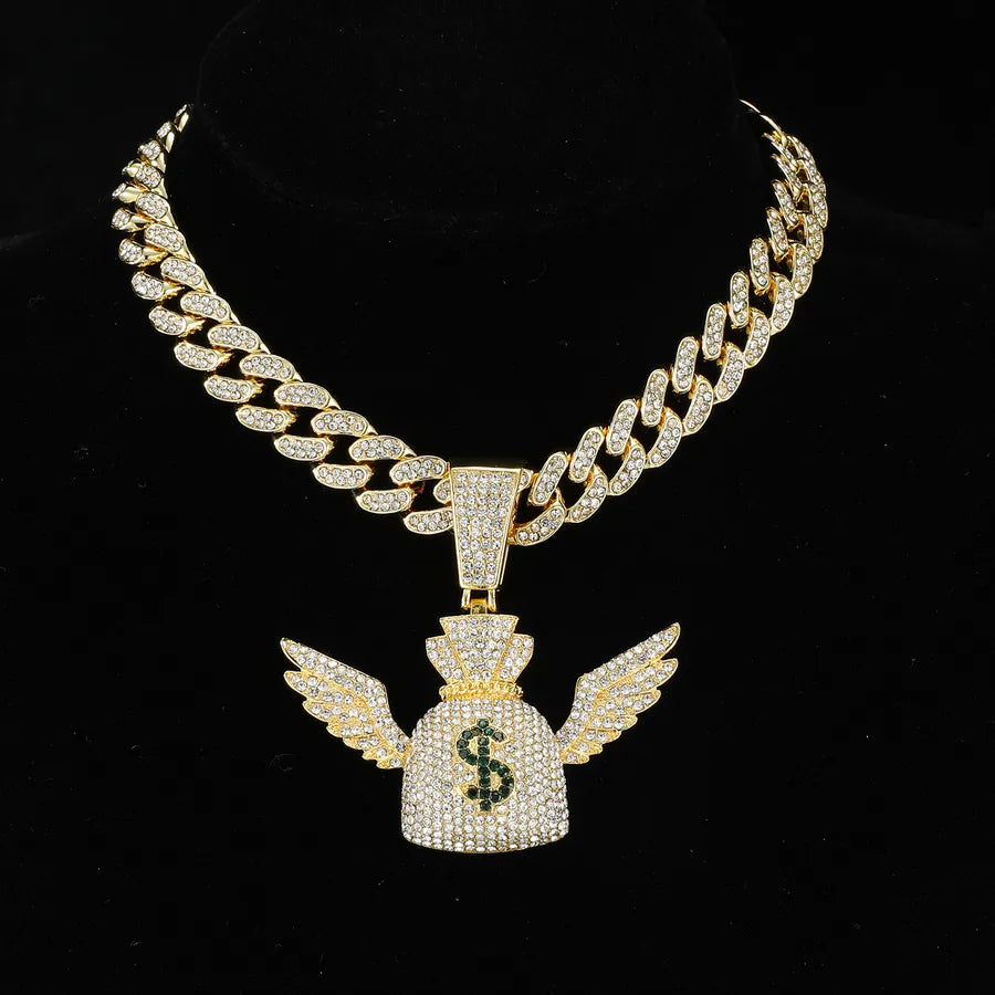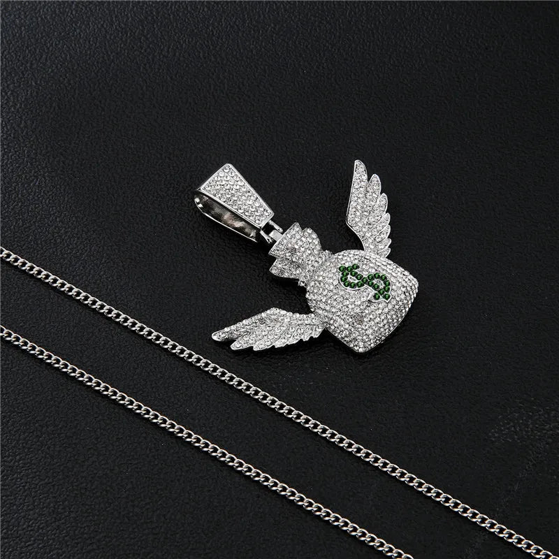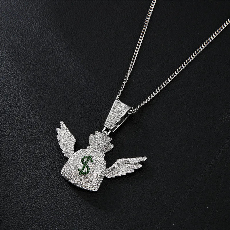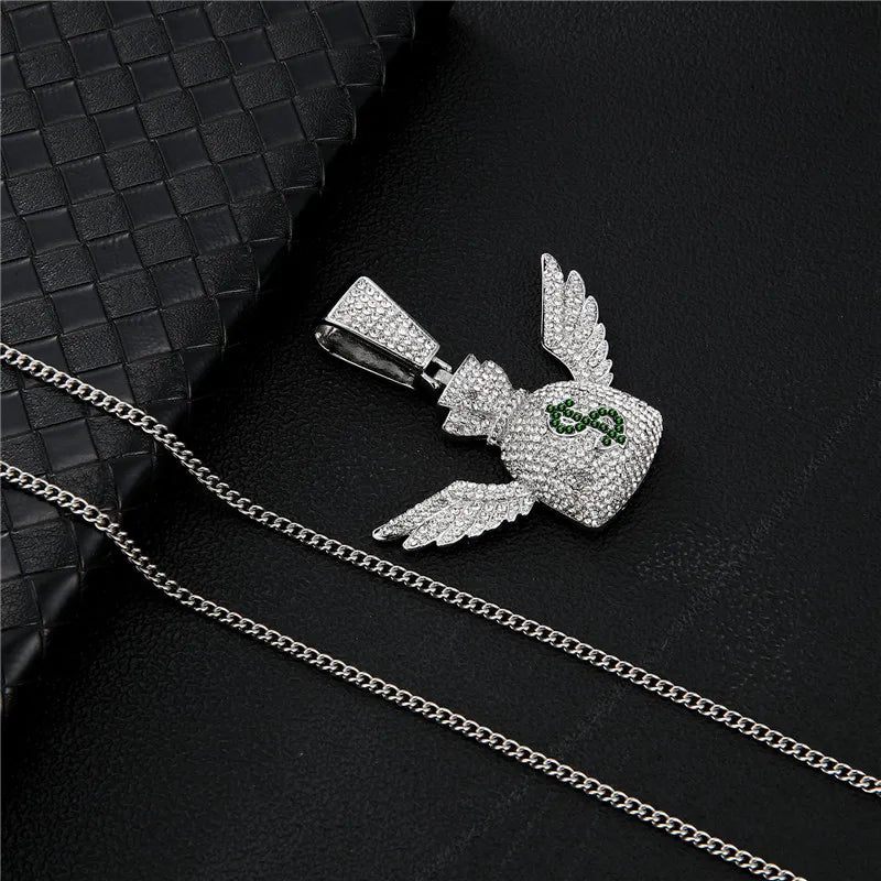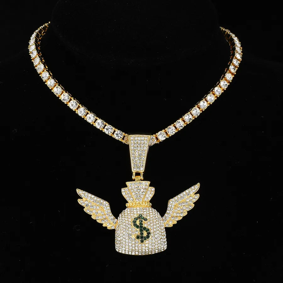 hip-hop dollar wings stainless steel alloy inlay rhinestones unisex pendant necklace - With Chain / Gold