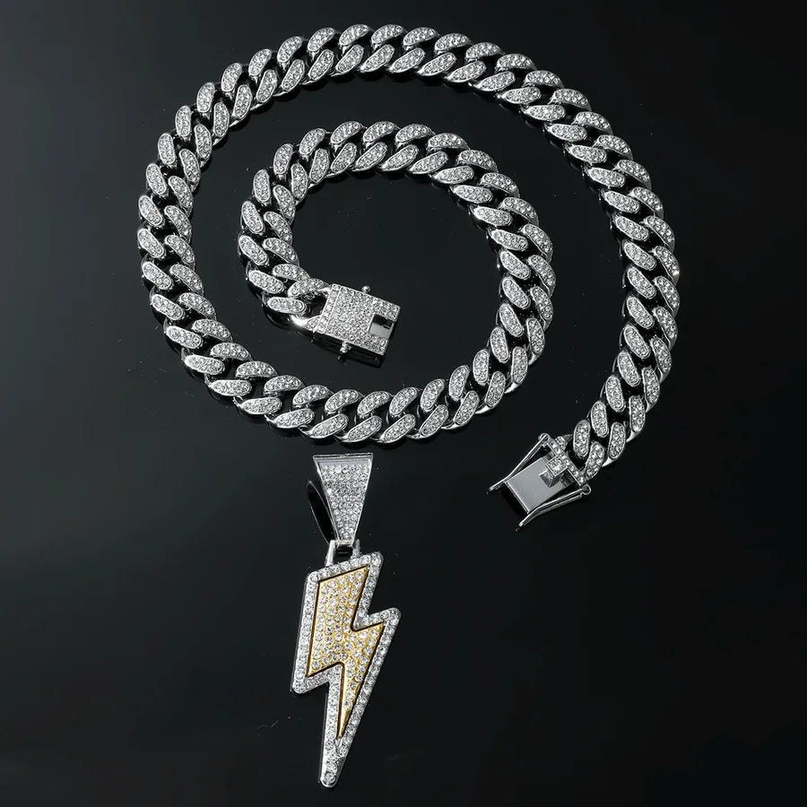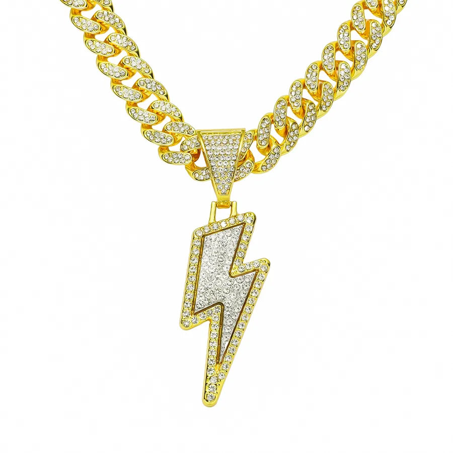 hip-hop lightning alloy plating inlay rhinestones men's pendant necklace - Gold (Lightning)-with 5525 Models 50cm Cuban Link Chain