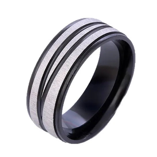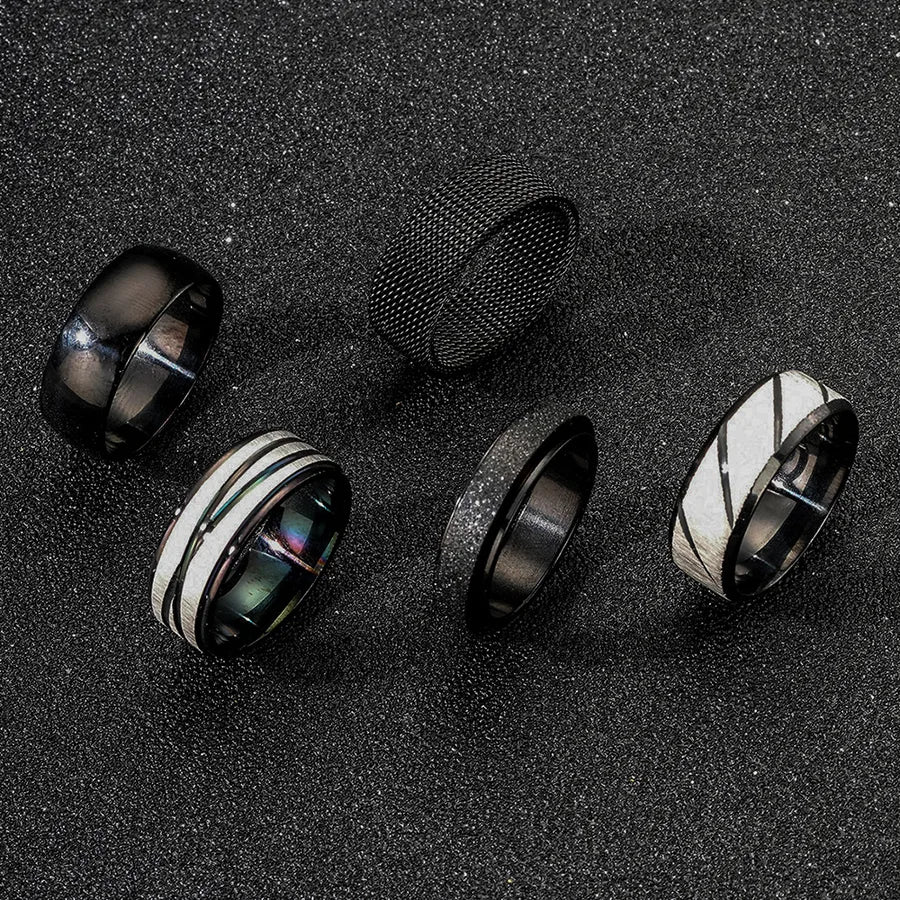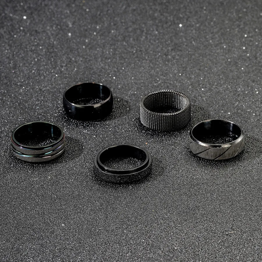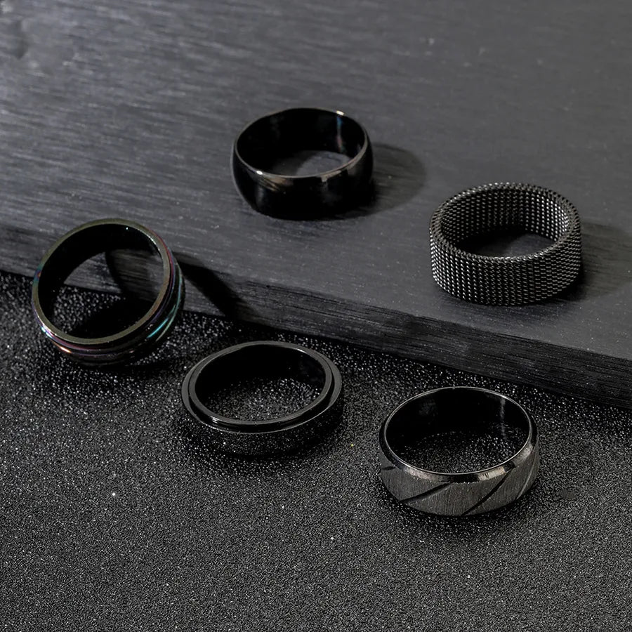 Fashionable Titanium Steel Rings Set For Men Wide Surface Diagonal Texture Style Stainless Steel Jewelry - 6 / Black Five-Piece Set
