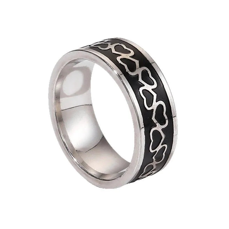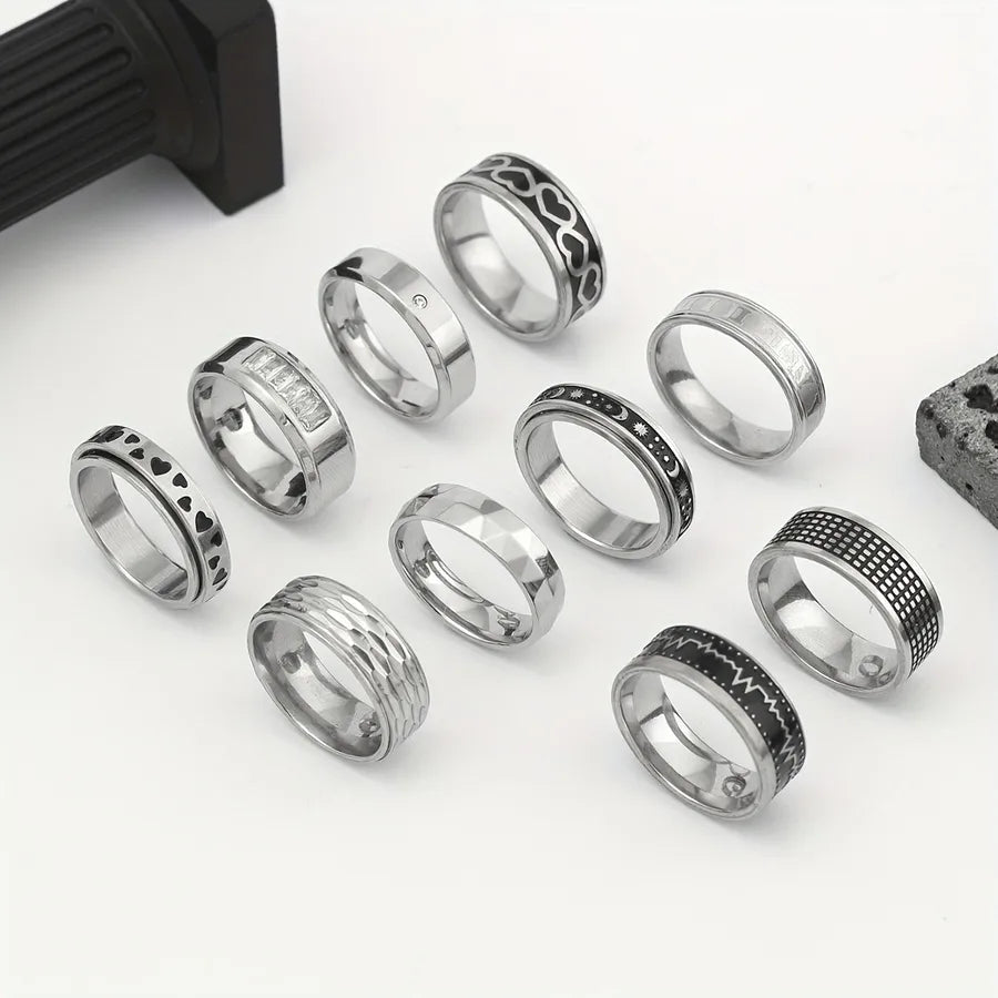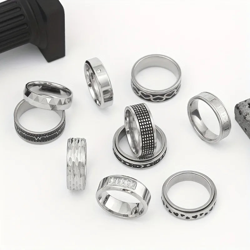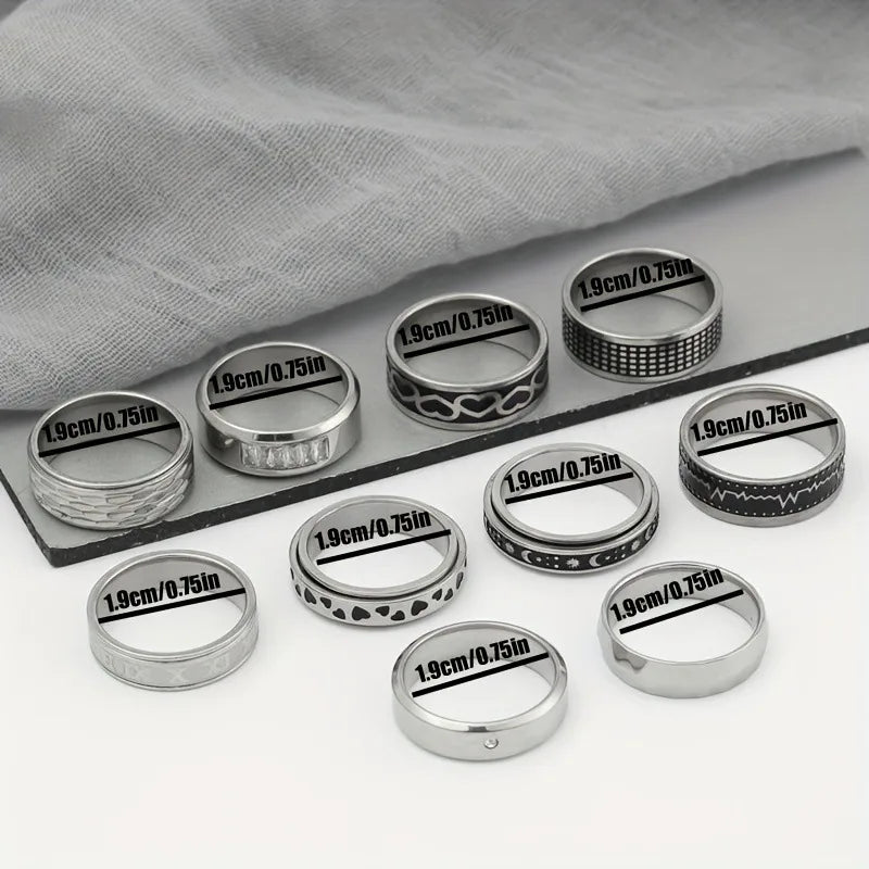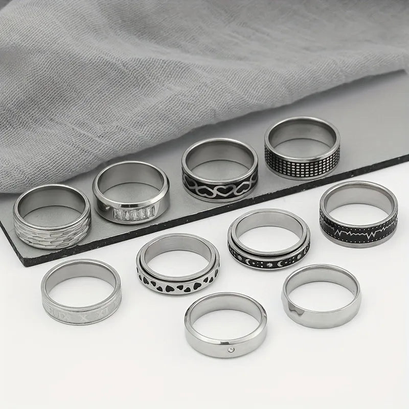 New Stainless Steel Titanium Steel Ring Set Rotatable Men's Ring Hip Hop Personality Jewelry Love Pattern Electroplated Craft - 9 / Steel Color Ten-piece Set