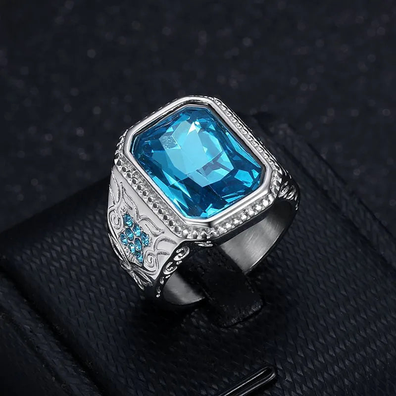 Europe and the United States new hip-hop HIPHOP titanium steel vacuum gold-plated ice blue rhinestone glass gemstone men's ring