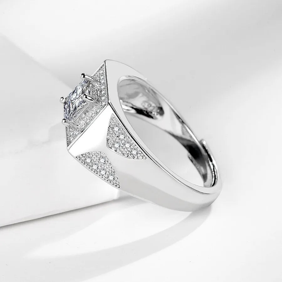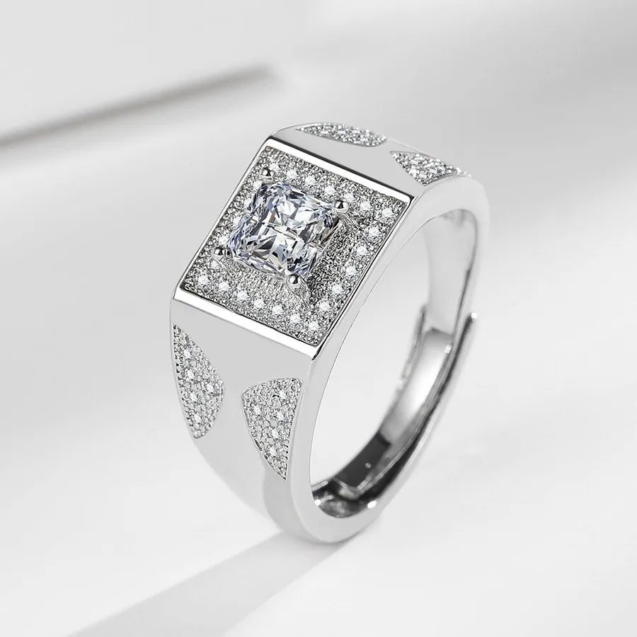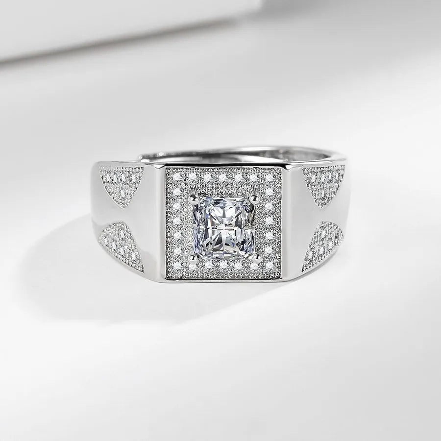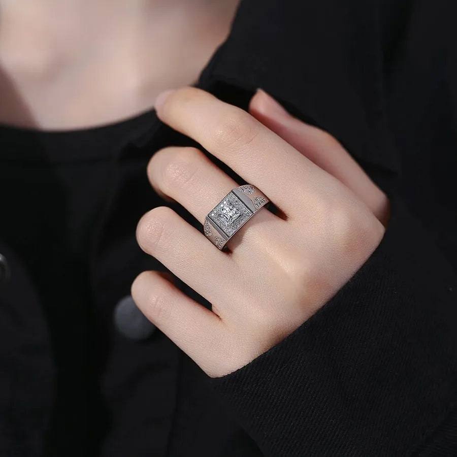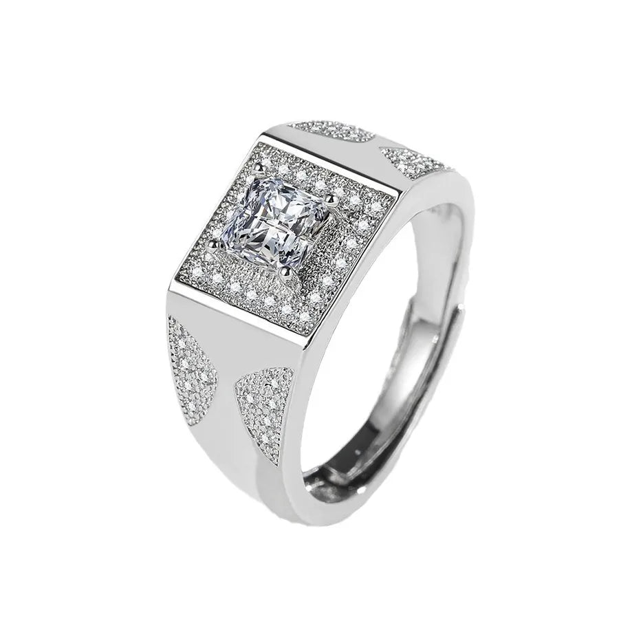 Square Men's Diamond Ring Wedding Ring Simulated Moissanite Men's Ring Hot Sale On TikTok Live Geometric Pattern Copper Material - White Gold Color (1 Karat)