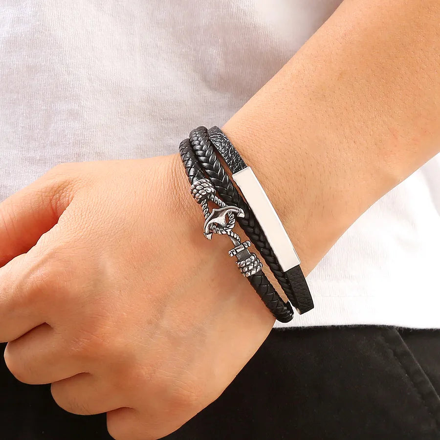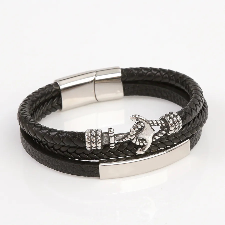 casual classical solid color anchor stainless steel pu leather handmade men's bangle - Black and White Steel