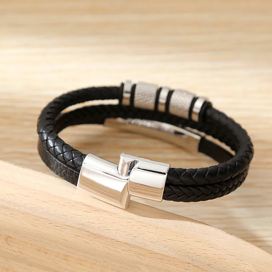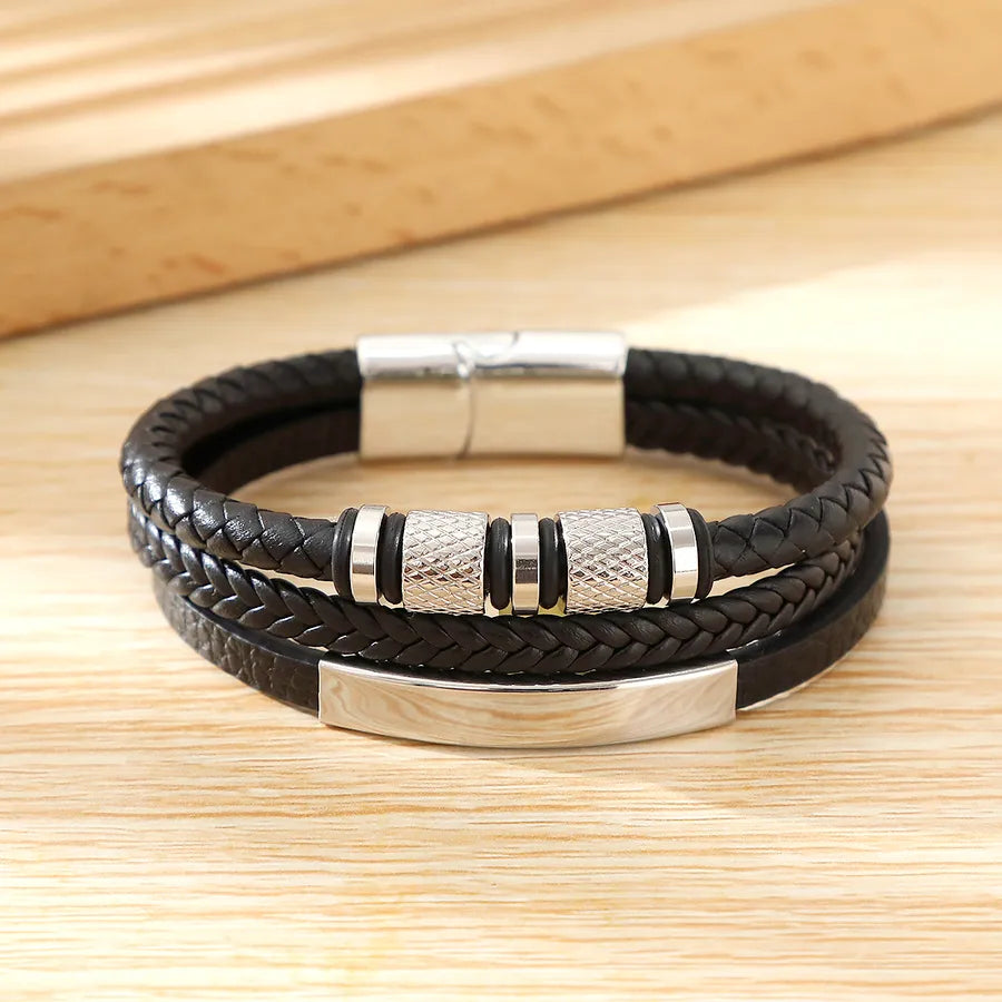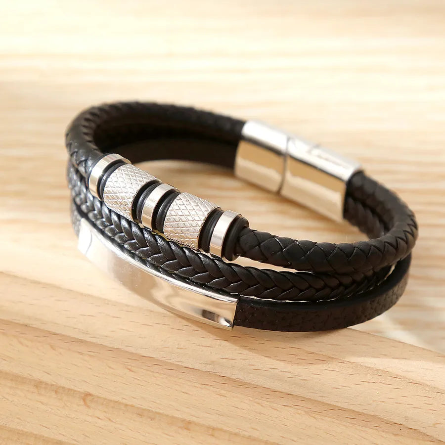 Casual Commute Cool Style Solid Color Pu Leather Layered Men's Bangle - Black + White Steel