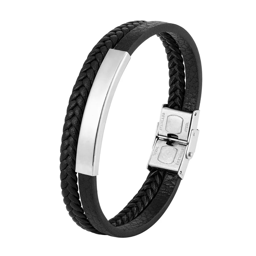 Double Layer Leather Cord Bracelet Men's Stainless Steel Genuine Leather Bracelet Handmade Leather Bangle Snap Bracelet Jewelry - Black 21cm