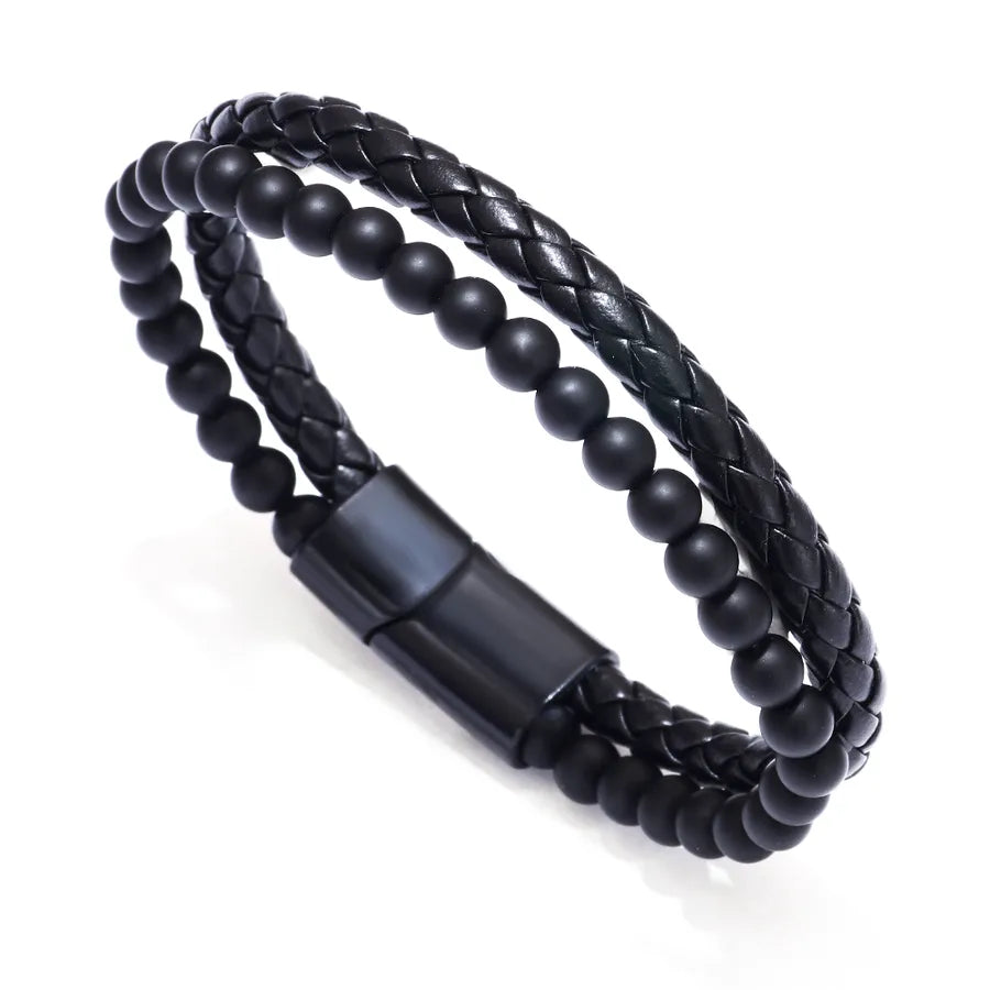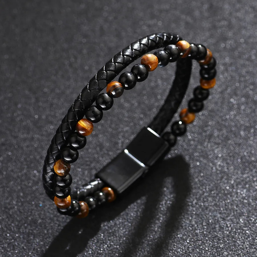 fashion stone pu leather alloy tiger eye knitting natural stone unisex bracelets - Black Matte Stone-19cm
