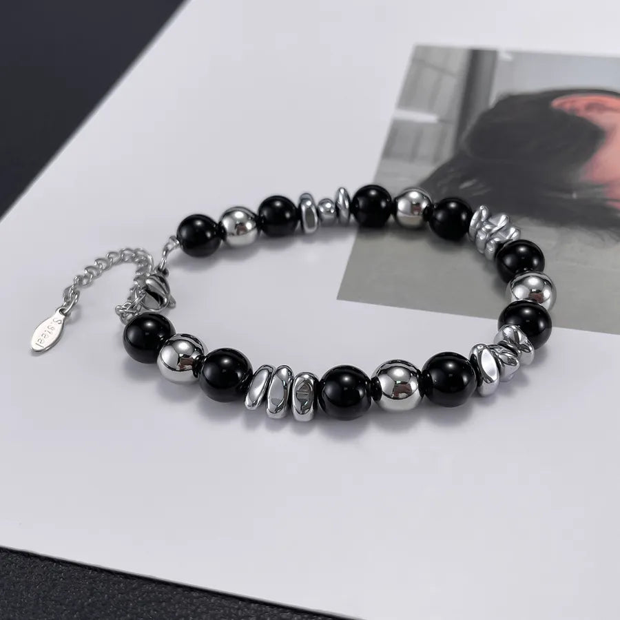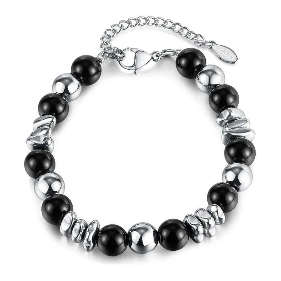 Fashionable Stainless Steel Bracelet Unisex Black Glass Beads Geometric Pattern Polished Finish Stylish Accessory For Men And Women