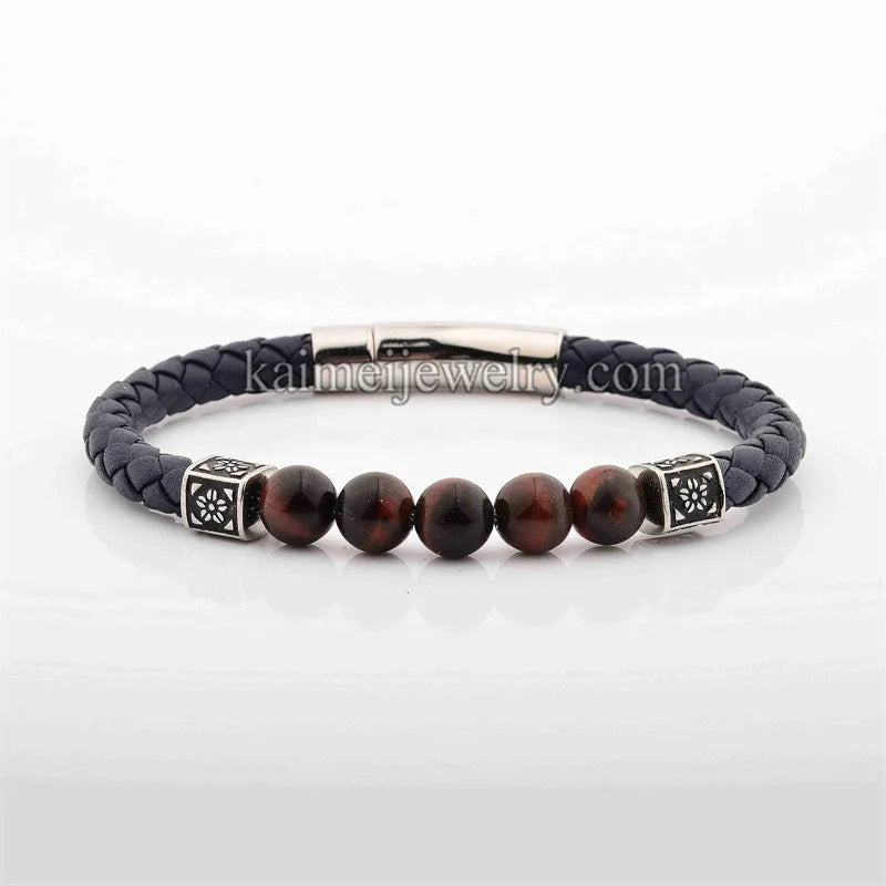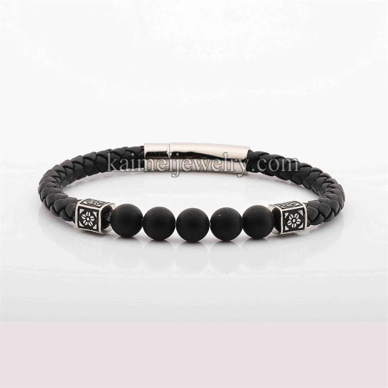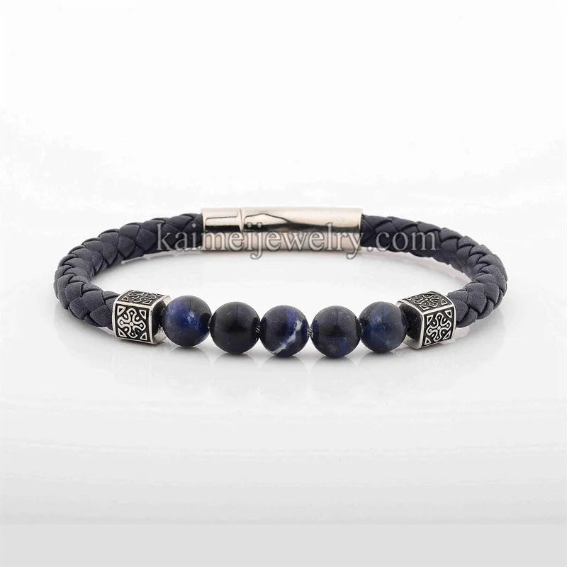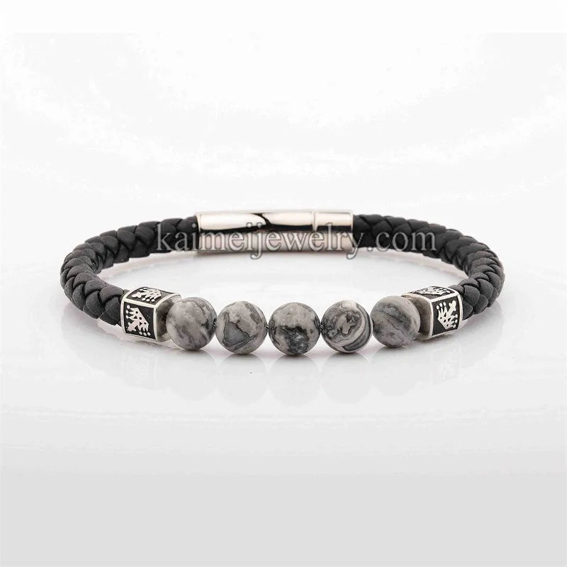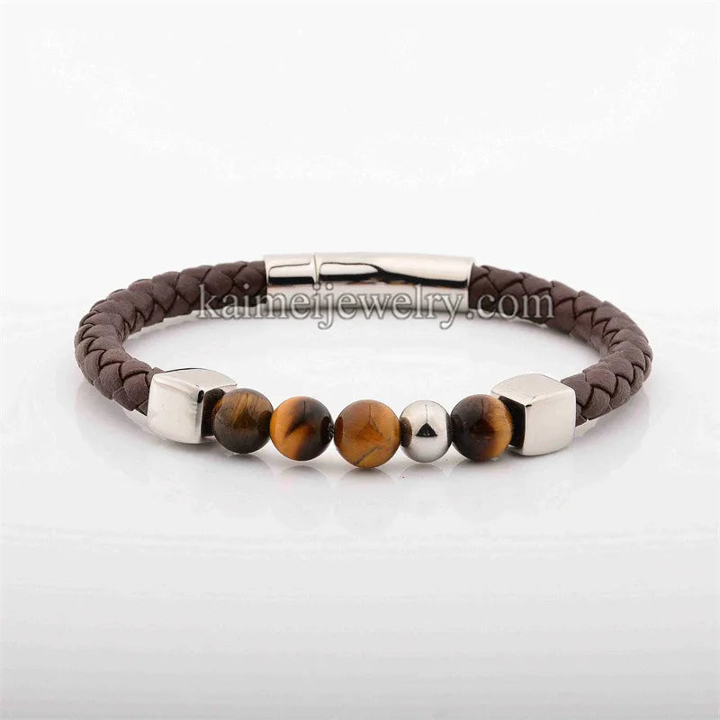 Fashionable Stainless Steel Leather Woven Bracelet Natural Stone Beaded Jewelry Hand Chain Accessory - KML1773