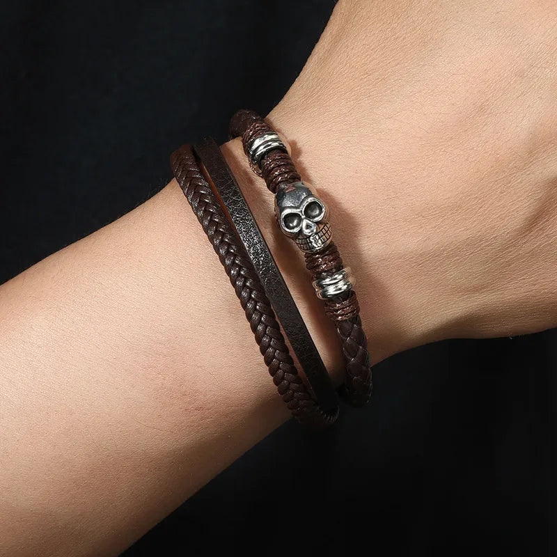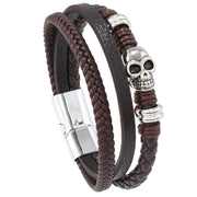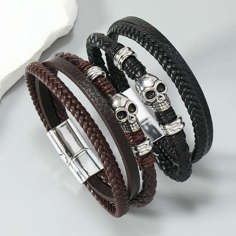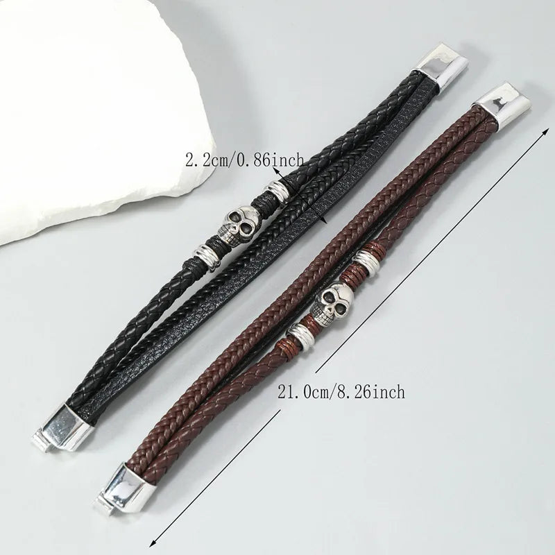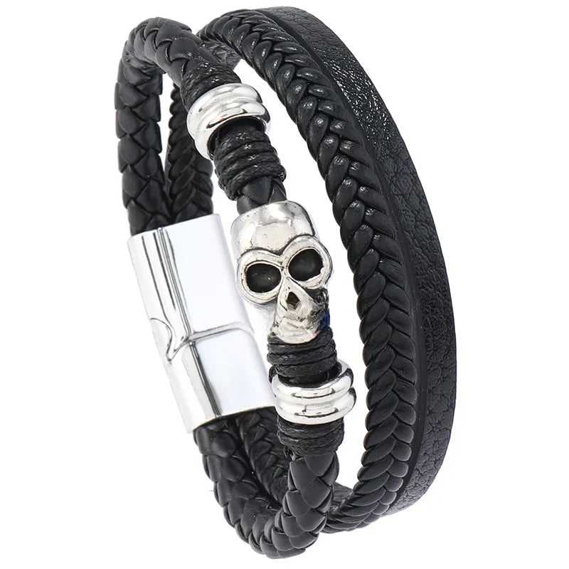 Handmade Leather Bracelet For Men Punk Style Skull Magnet Buckle Bracelets Universal Geometric Pattern Jewelry - Black