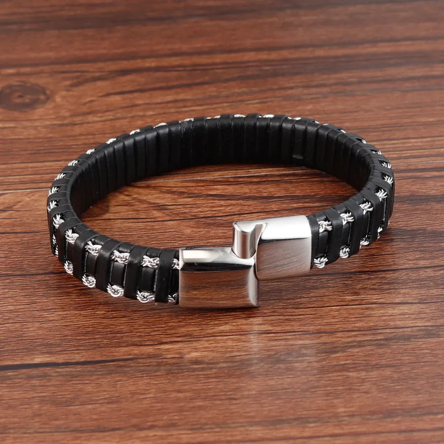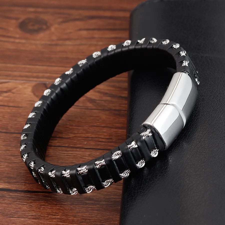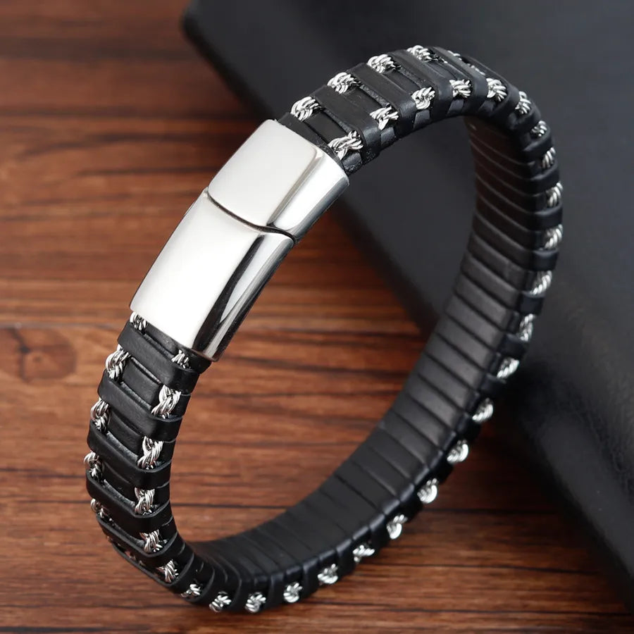 Handmade Leather Bracelet Woven Stainless Steel Chain Genuine Leather Men's Wristband L19131 Business Anniversary Gifts - 21cm