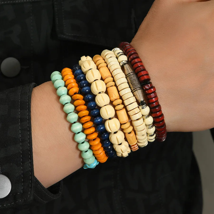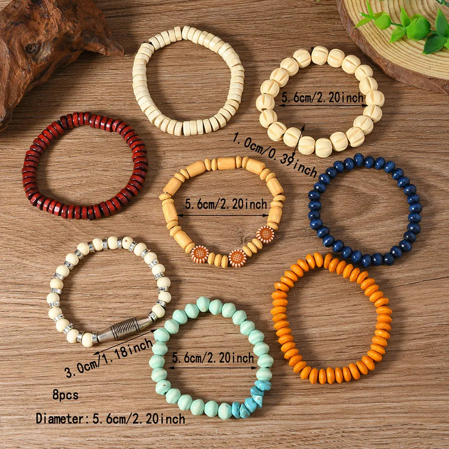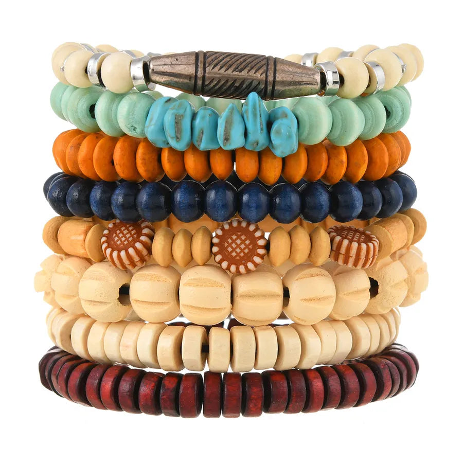 New 8-Piece Handmade Beaded Bracelet Men's Retro Style Multi-Layer Filament Wooden Bead Combination Bracelet - 8-Piece Set