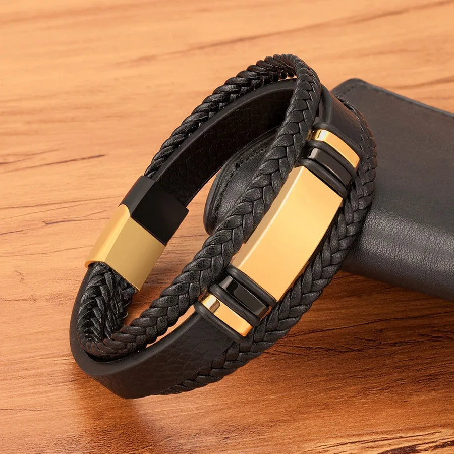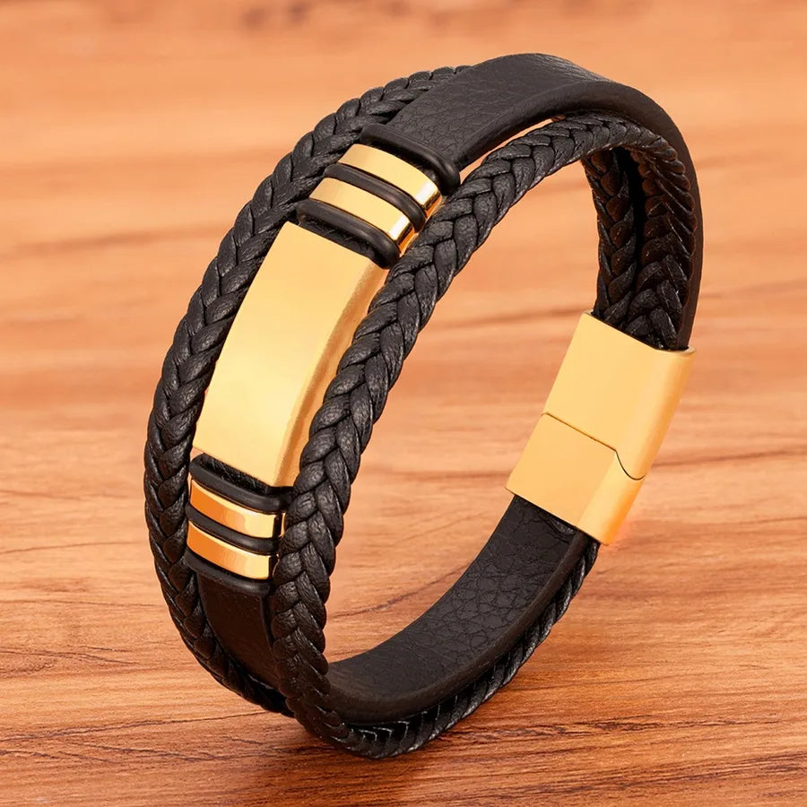 New Stainless Steel Men's Leather Bracelet Multi-layer Woven 4 Colors Cuff Accessories Fashionable European Style Hand Chain - Steel Color / 19cm