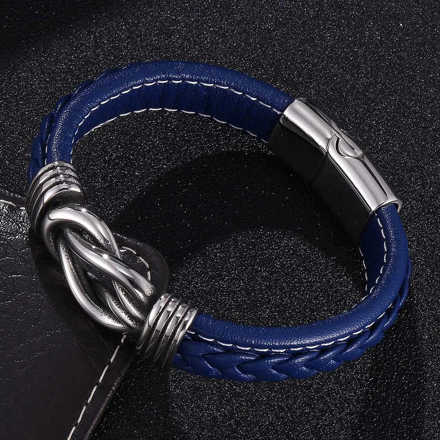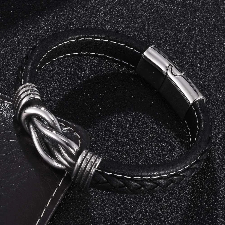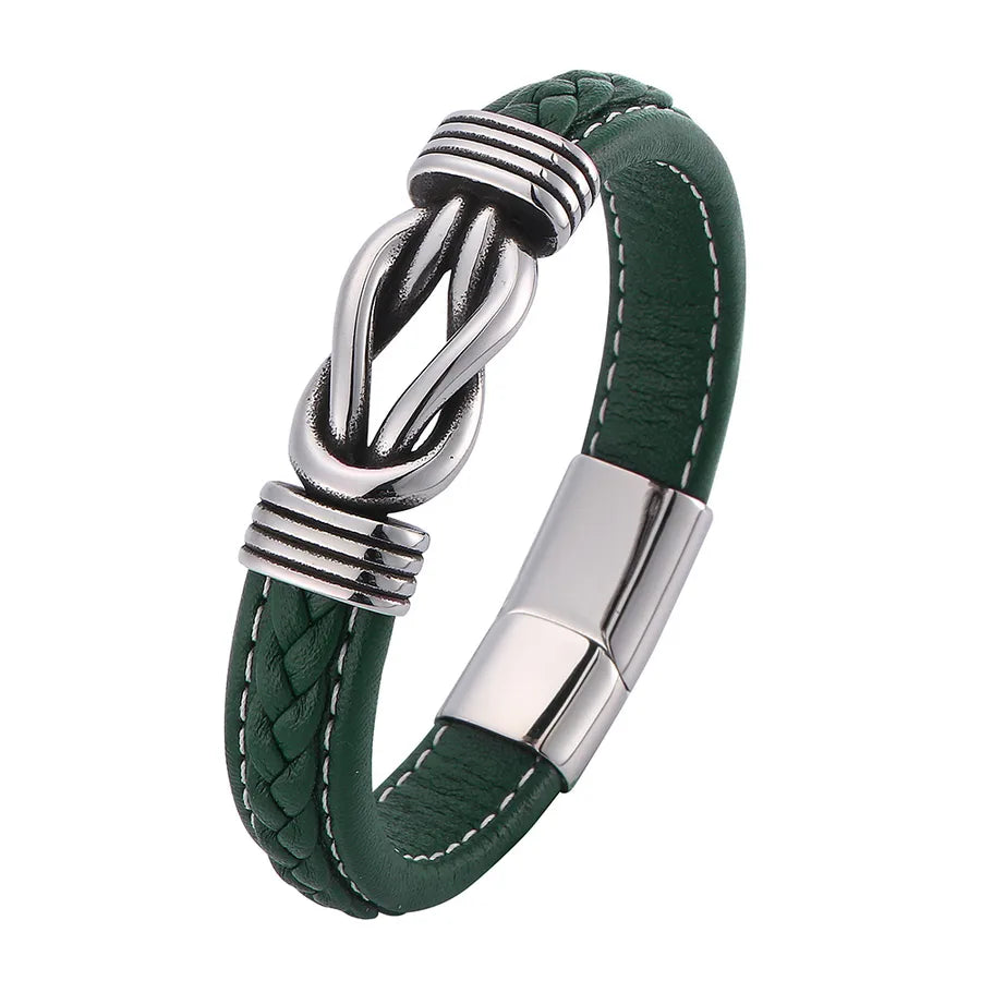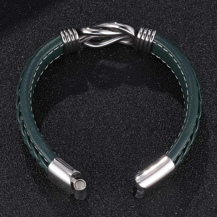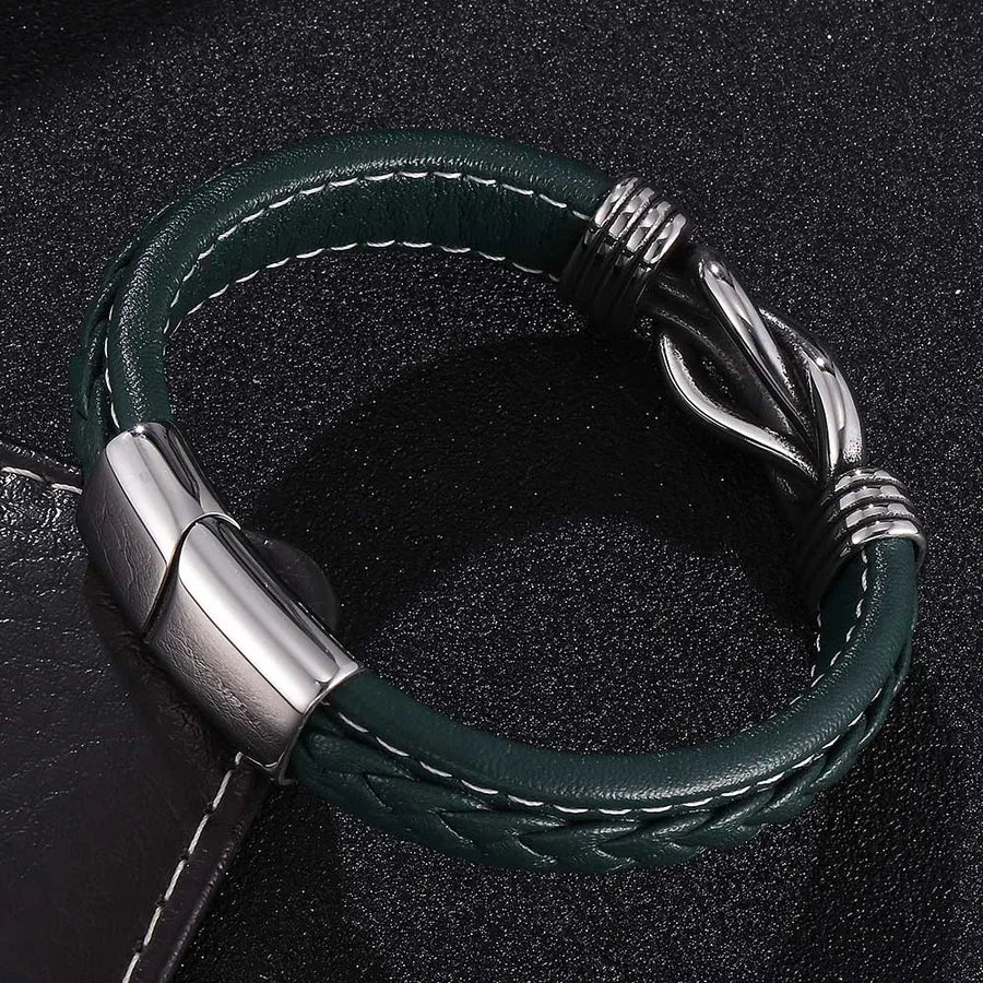 punk geometric stainless steel pu leather men's bracelets - Green Leather [Steel Color]] / Inner Ring 165mm [Straightening Full Length 194mm]]