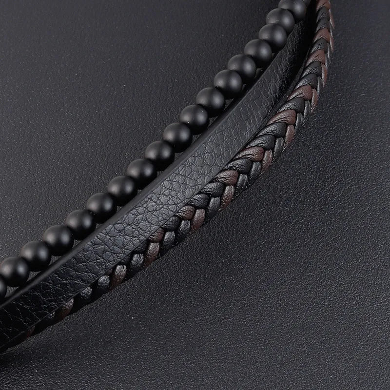 retro punk geometric pu leather natural stone beaded knitting men's bracelets - Black