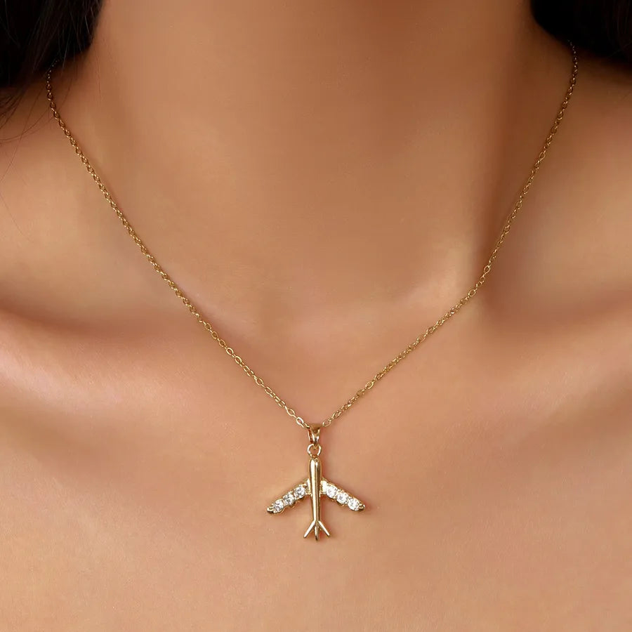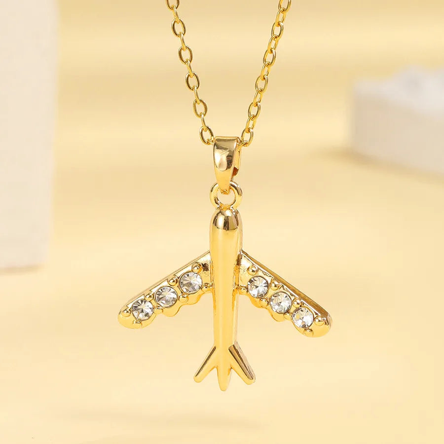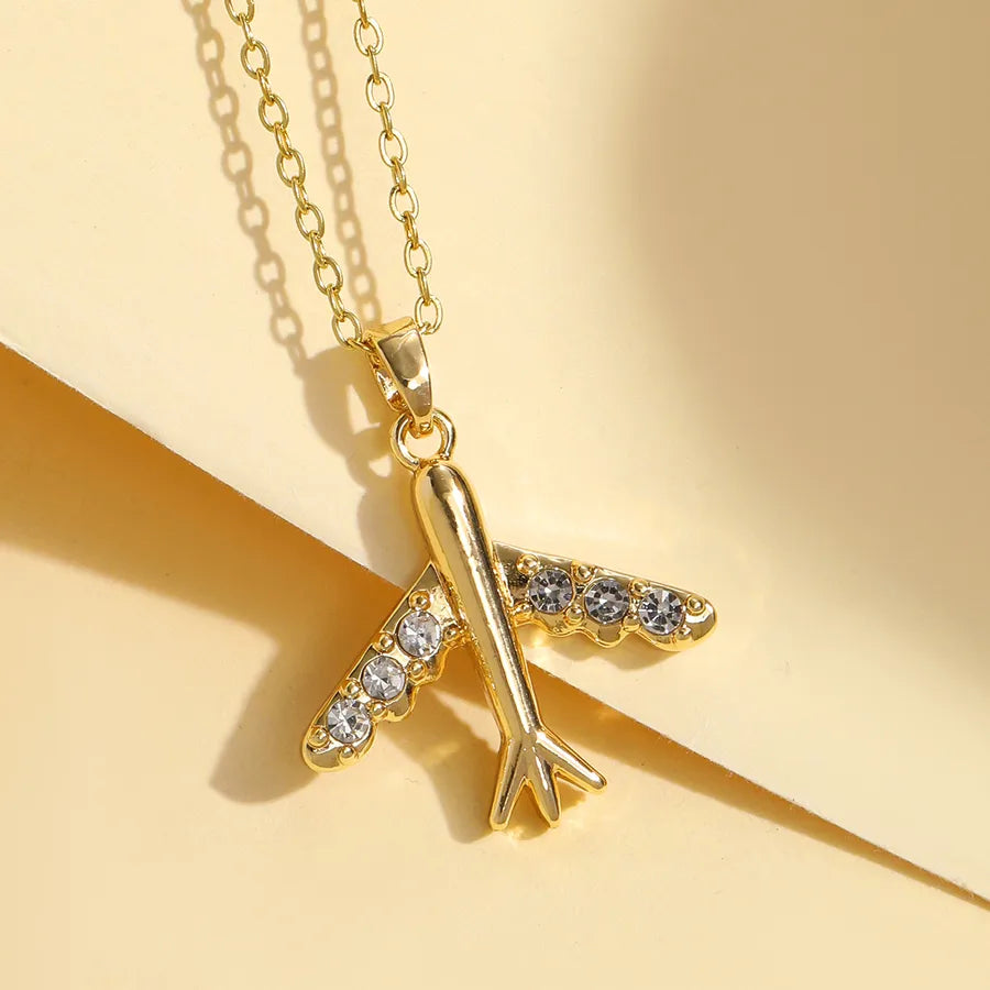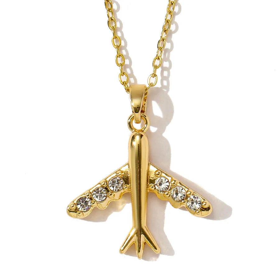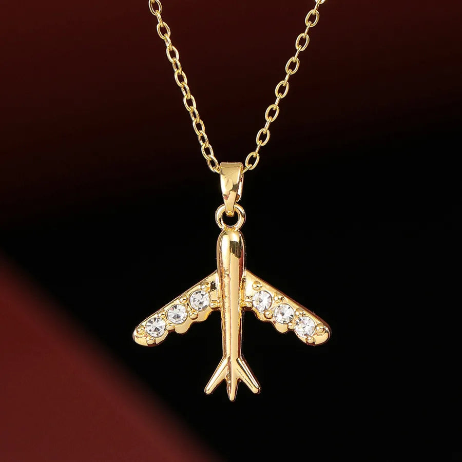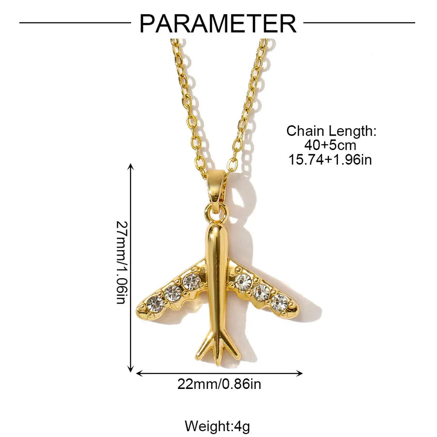 18K Gold Plated Diamond Embedded Airplane Pendant Necklace For Women Casual Travel Everyday Alloy Material Stainless Steel Chain Lobster Clasp