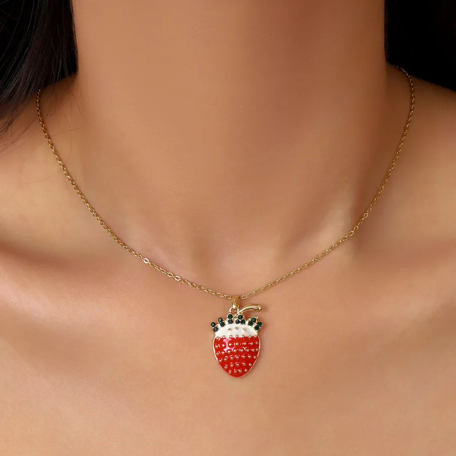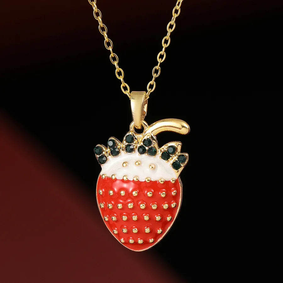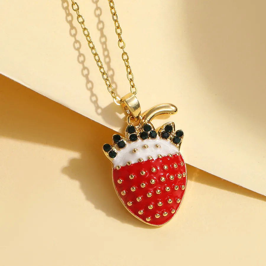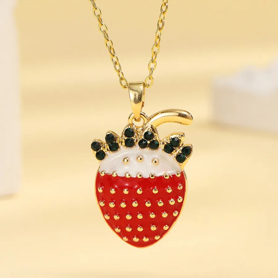 18K Gold Plated Strawberry Pendant Necklace For Women Cute Diamond Embedded Casual Travel Everyday Alloy Material Stainless Steel Chain Lobster Clasp
