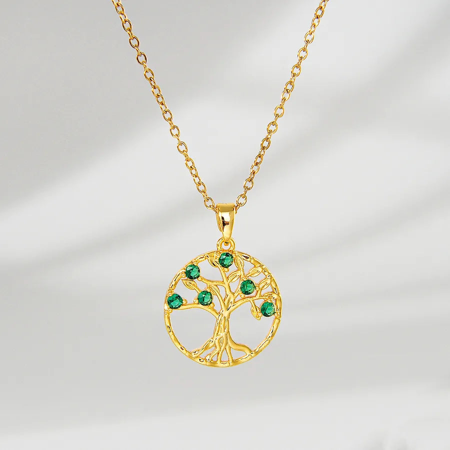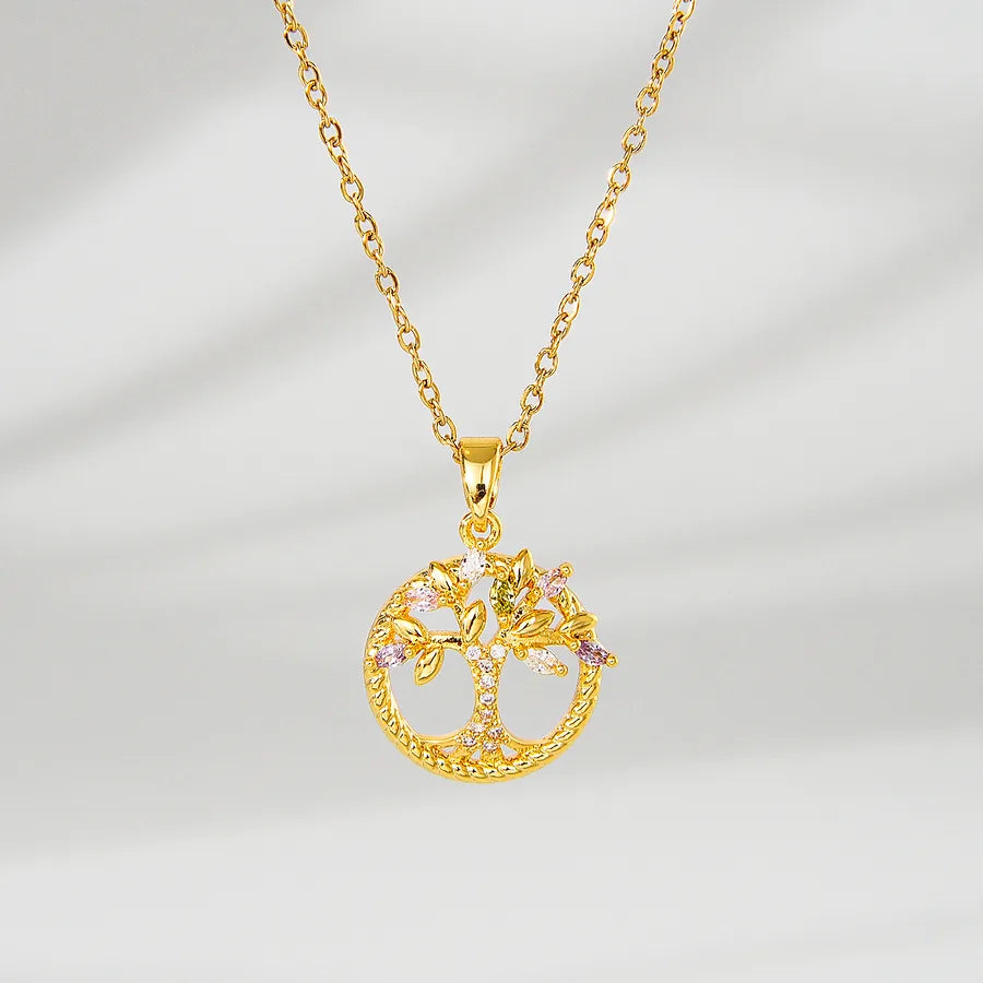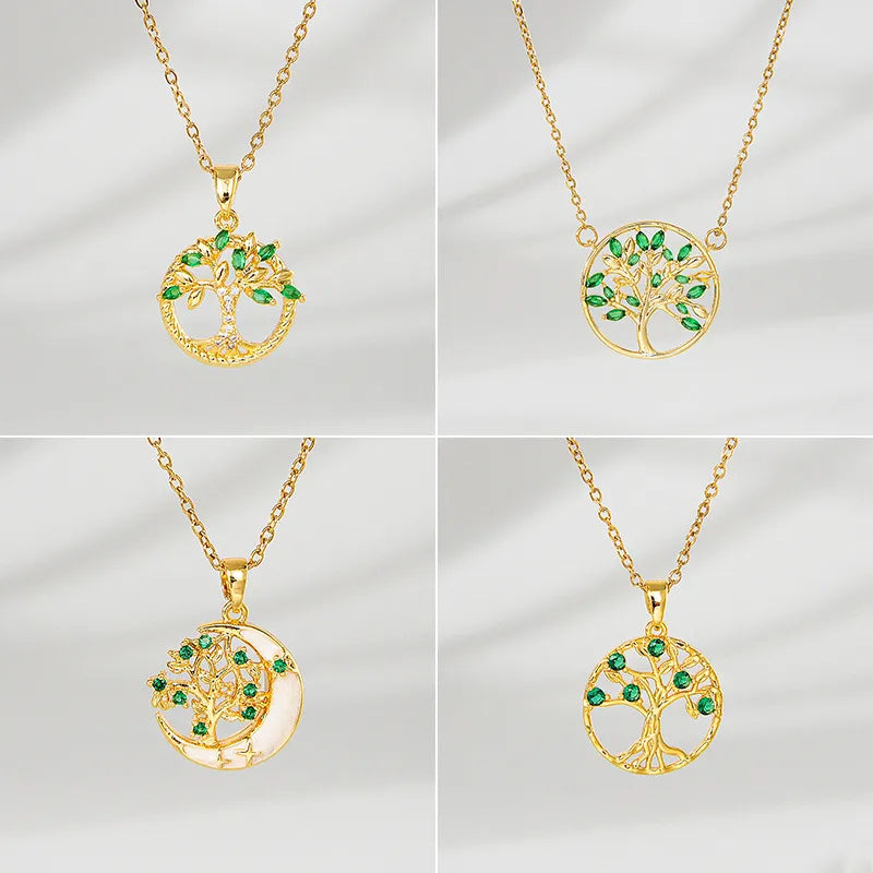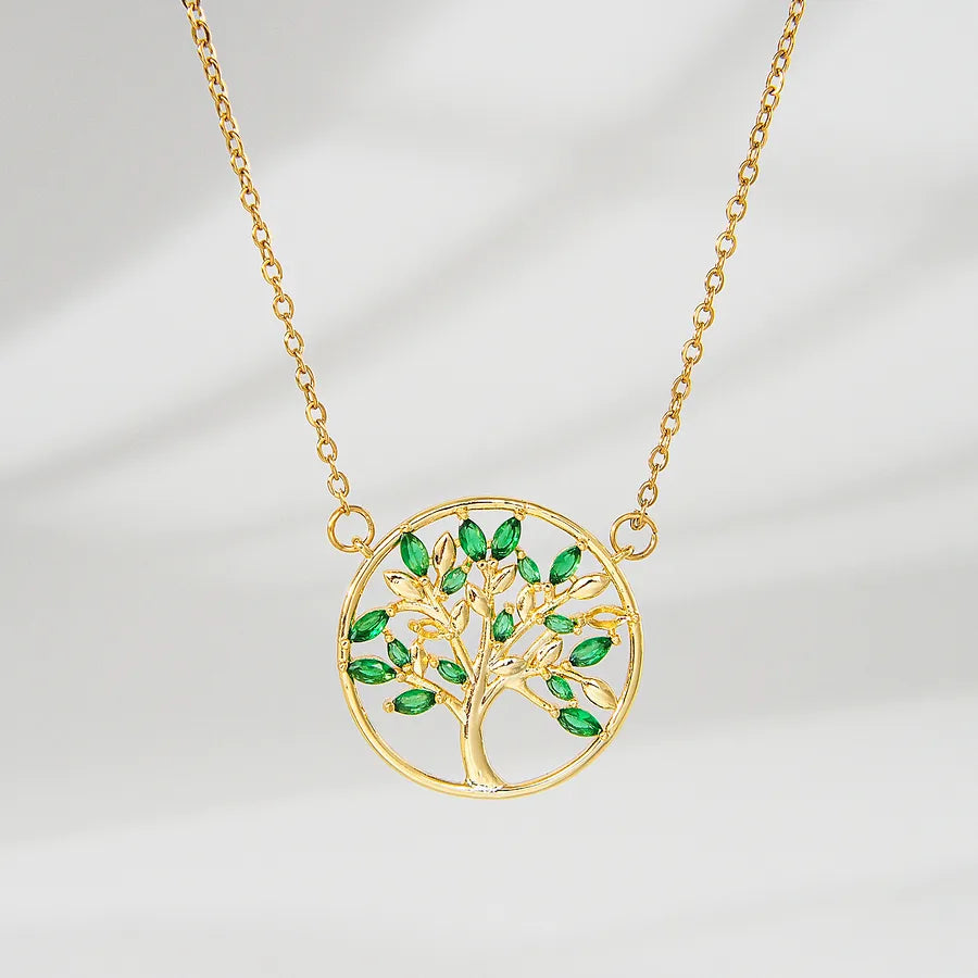 Elegant Hollow Out Tree Of Life Pendant Necklace Titanium Steel Zircon Plated Non Fading Copper Alloy Personalized Jewelry For Women - Titanium Steel Cross Chain + 18K Gold: Multi Green Horse Eye Zircon Life Tree Necklace