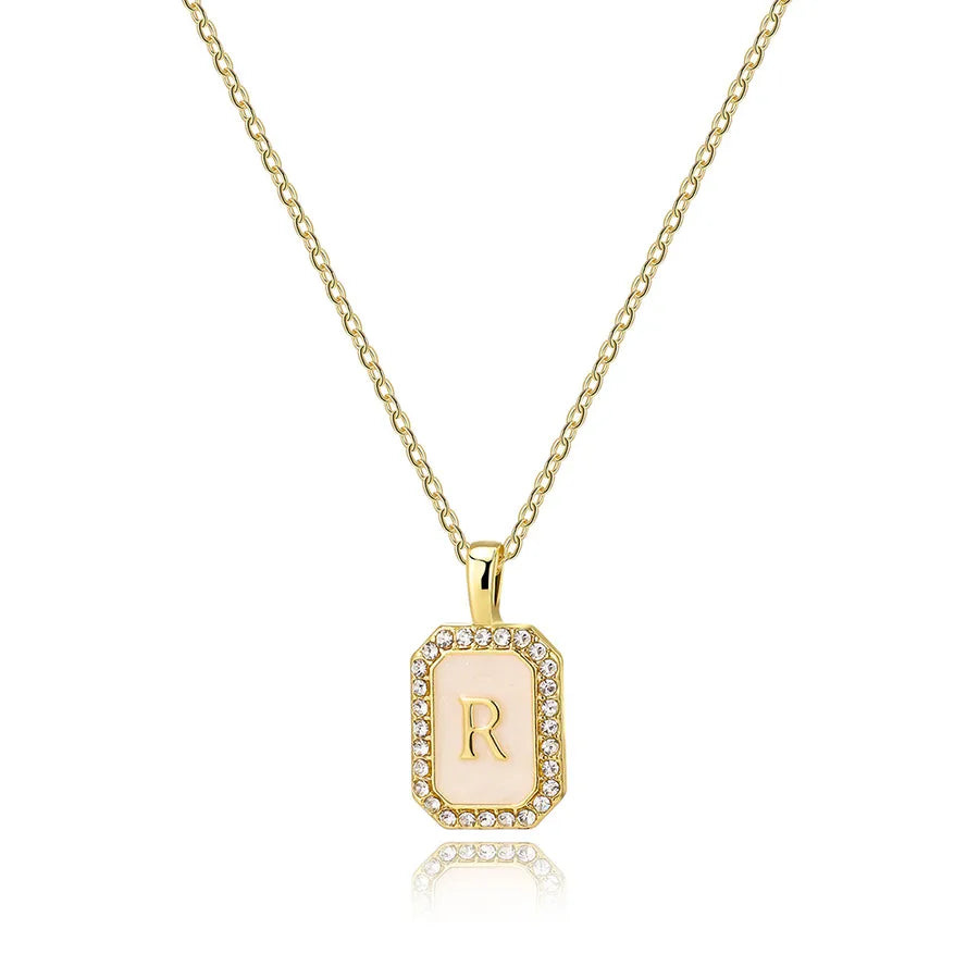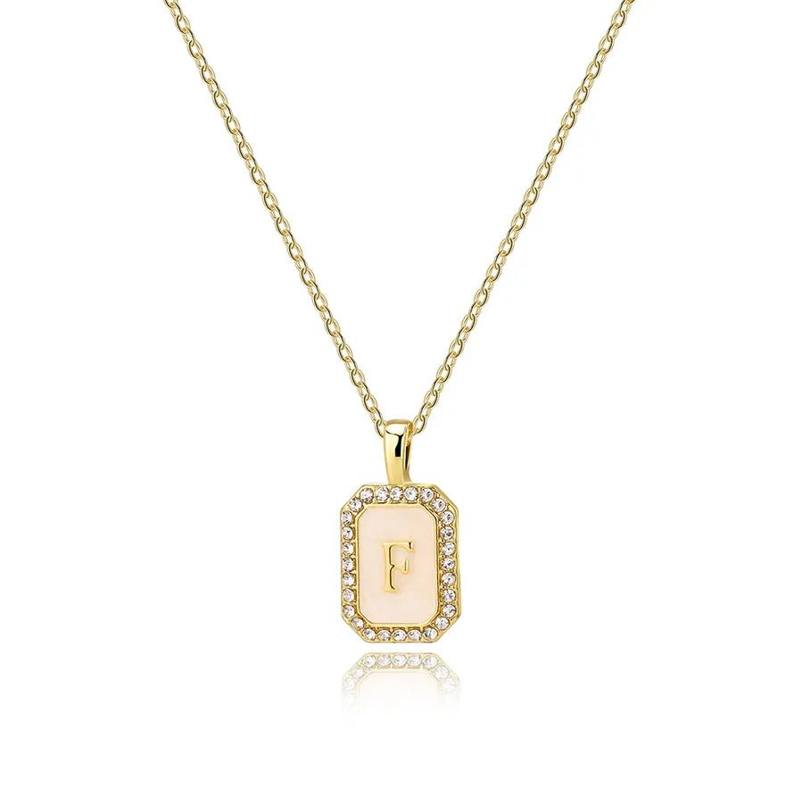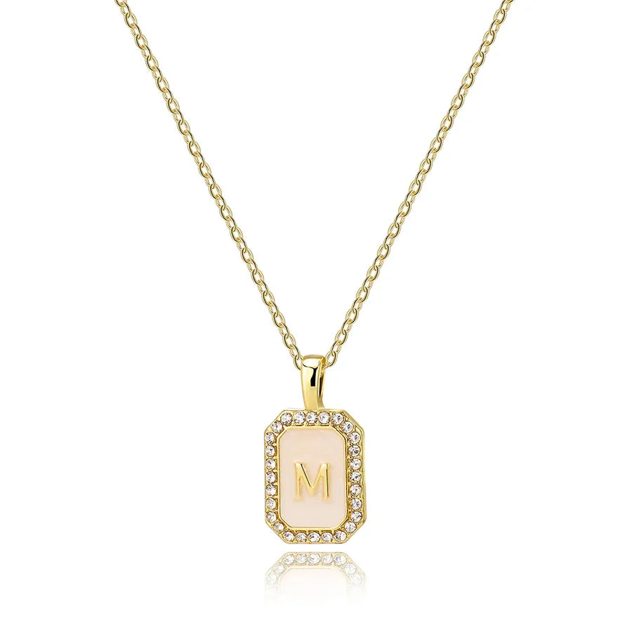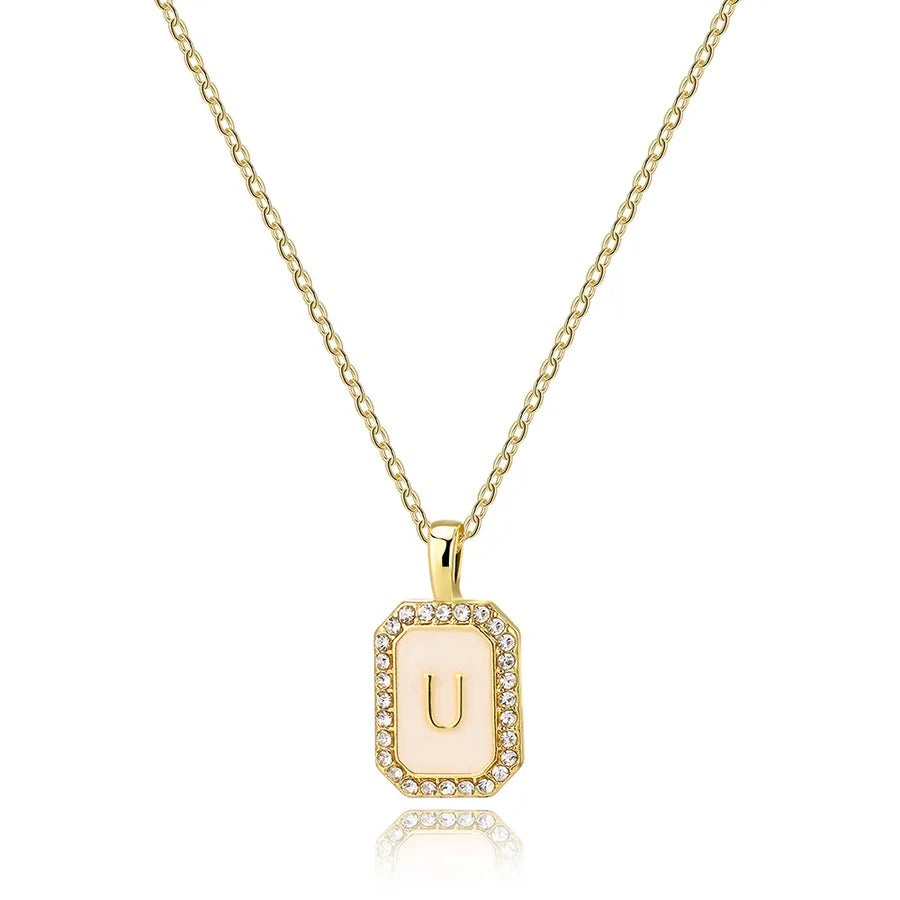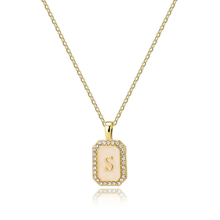 Fashionable Square Letter Shell Pendant Necklace 26 English Alphabet Zircon Stone Women's Personalized Alloy Jewelry Accessory - A