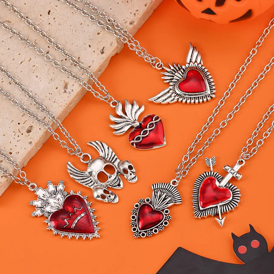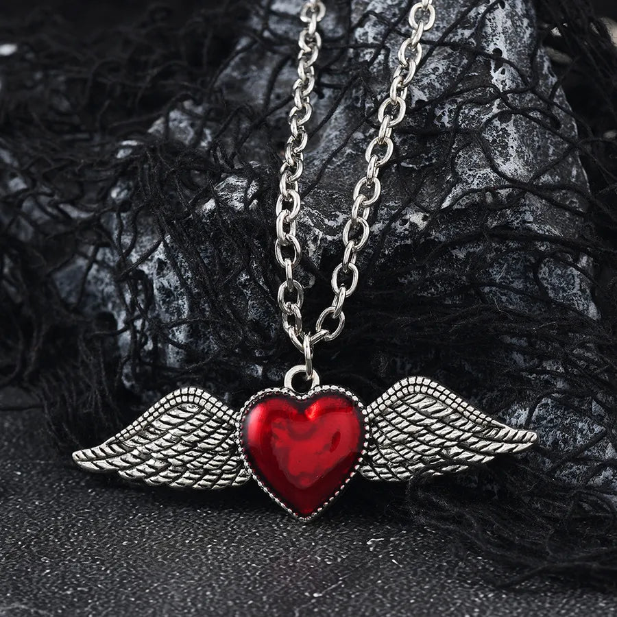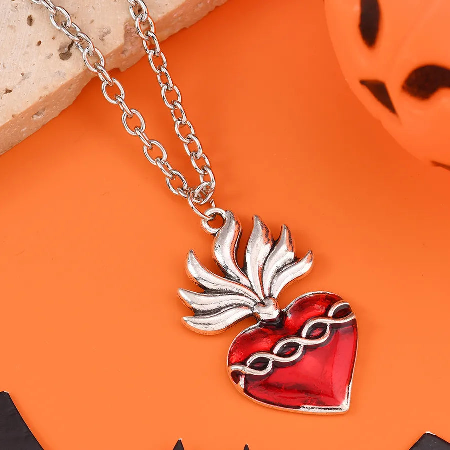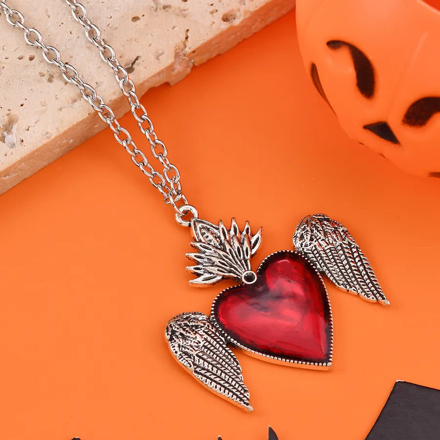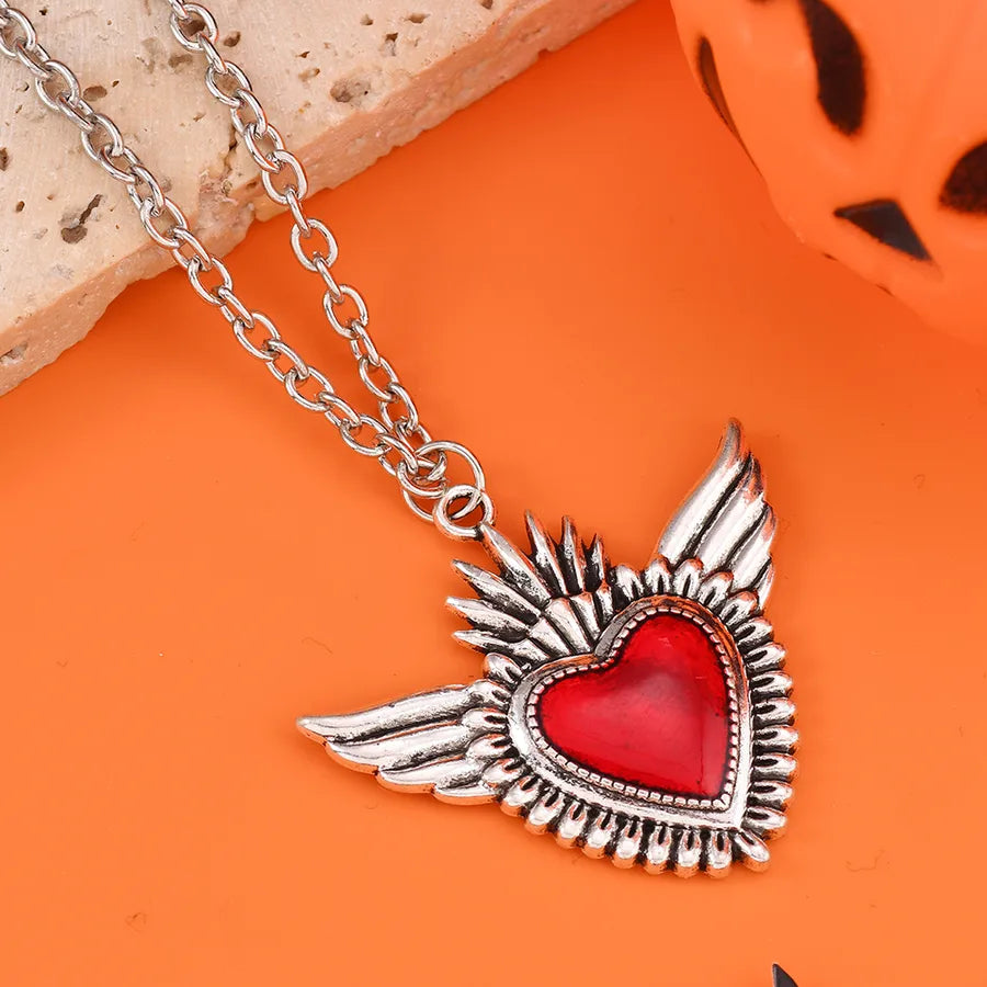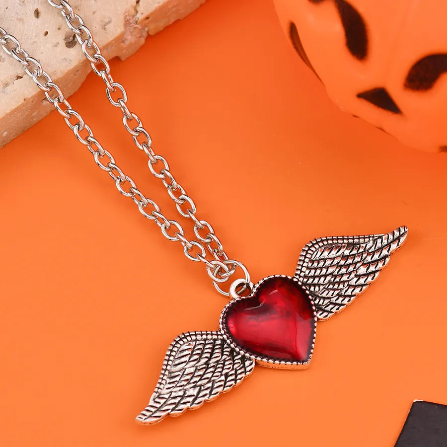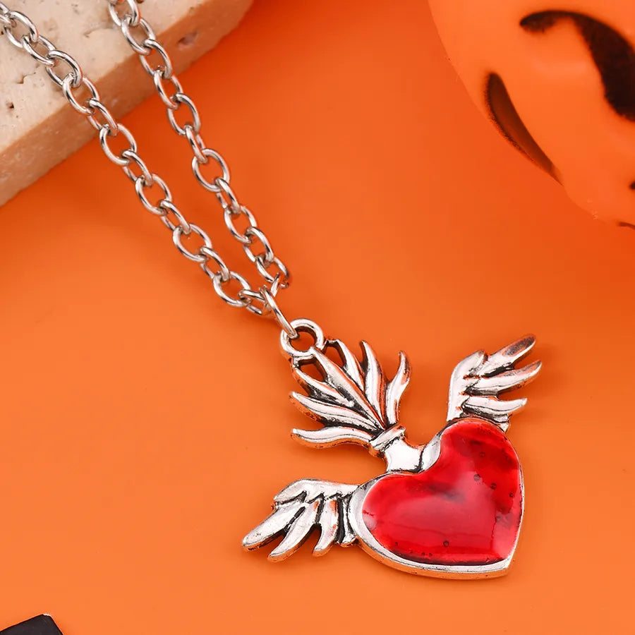 Gothic Style Heart Wing Halloween Creative Alloy Supernatural Love Necklace Unisex Red Heart Shaped Pendant Club Party Jewelry Accessory