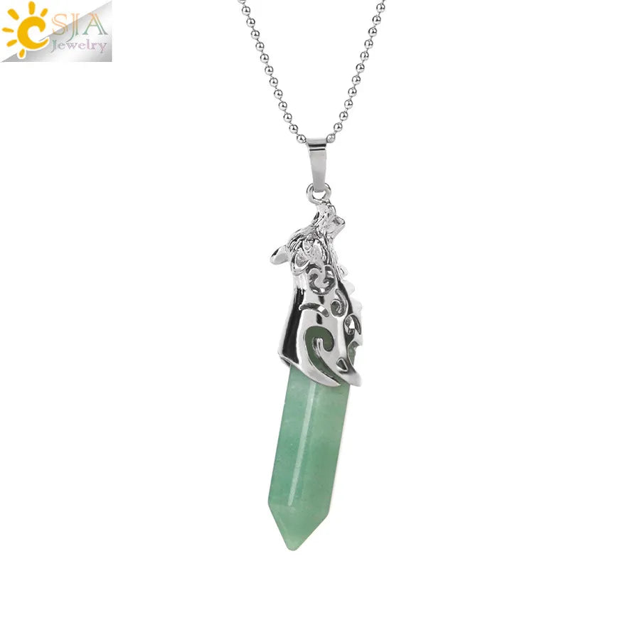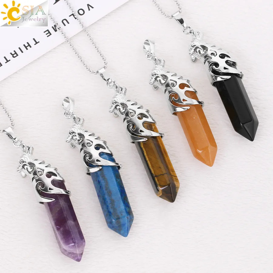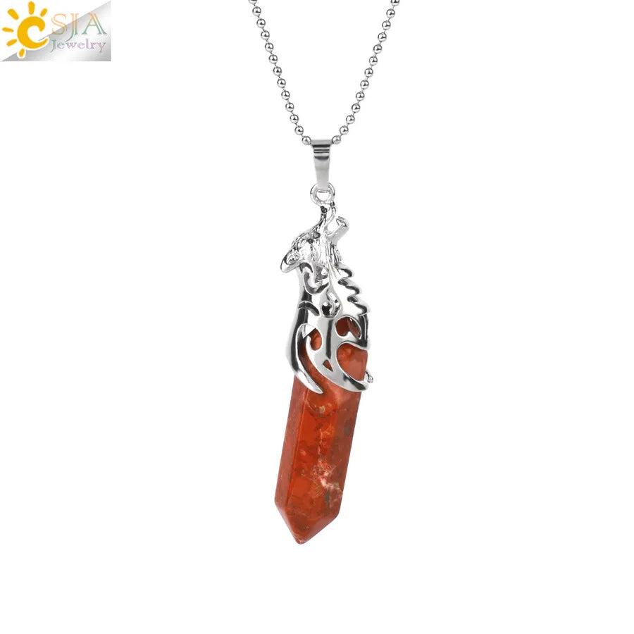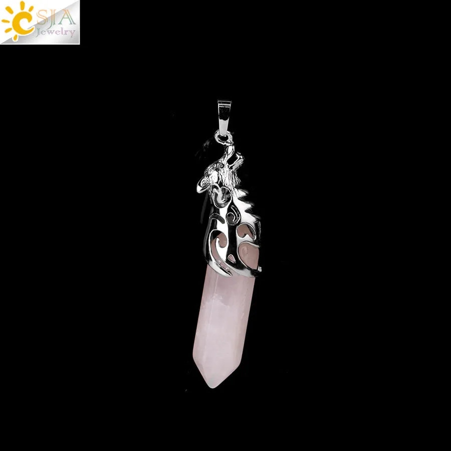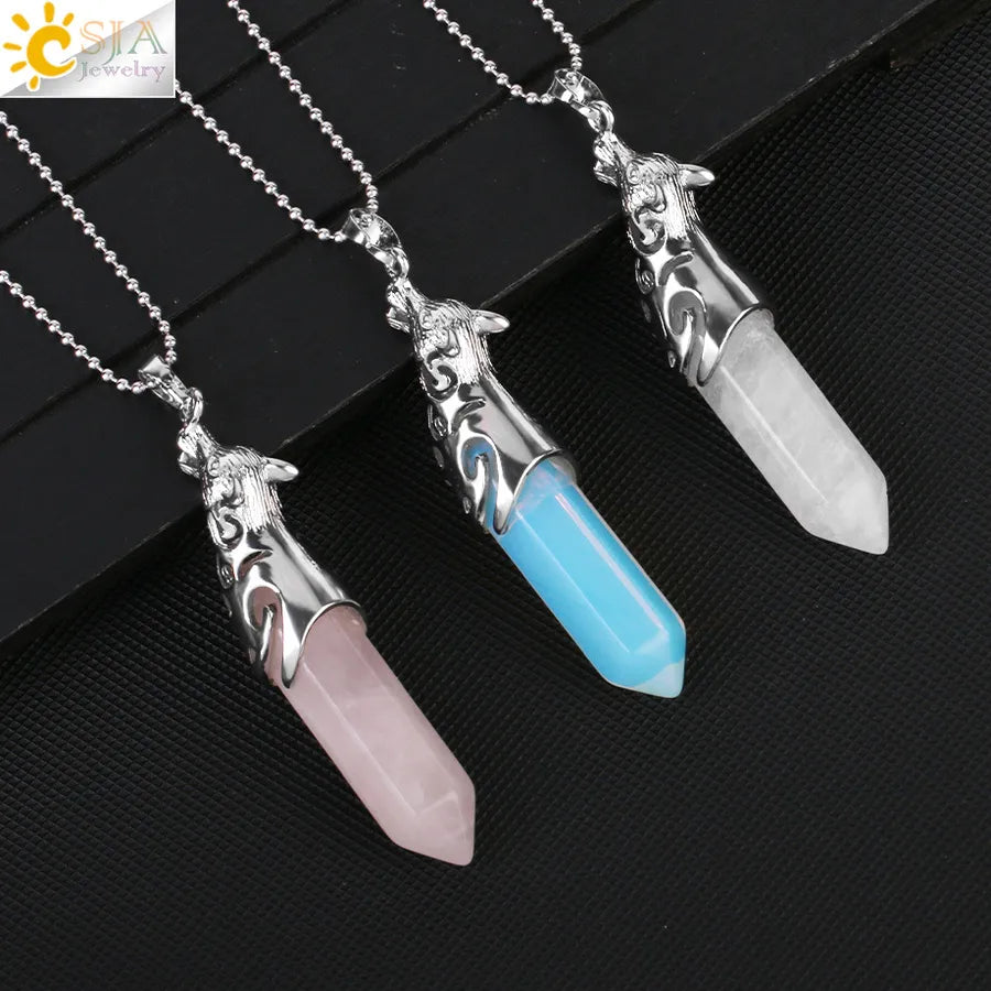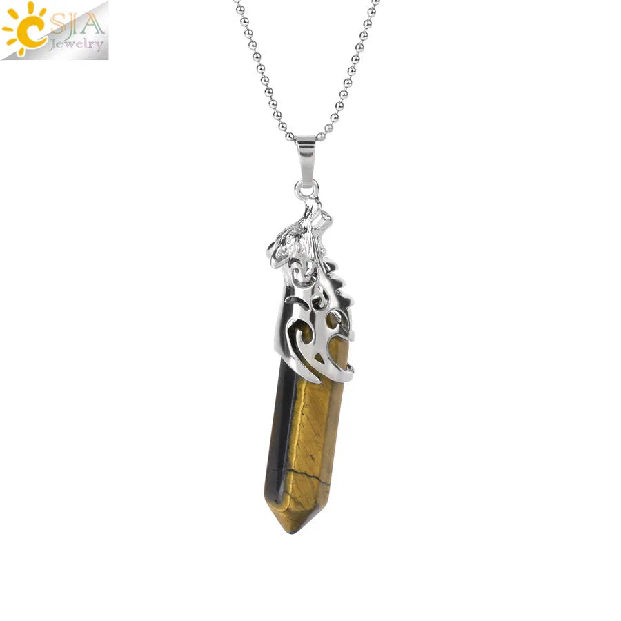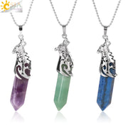 Natural Crystal Wolf Head Pendant Necklace Hexagonal Column Tiger Eye Obsidian Jewelry Unisex Simple Geometric Design