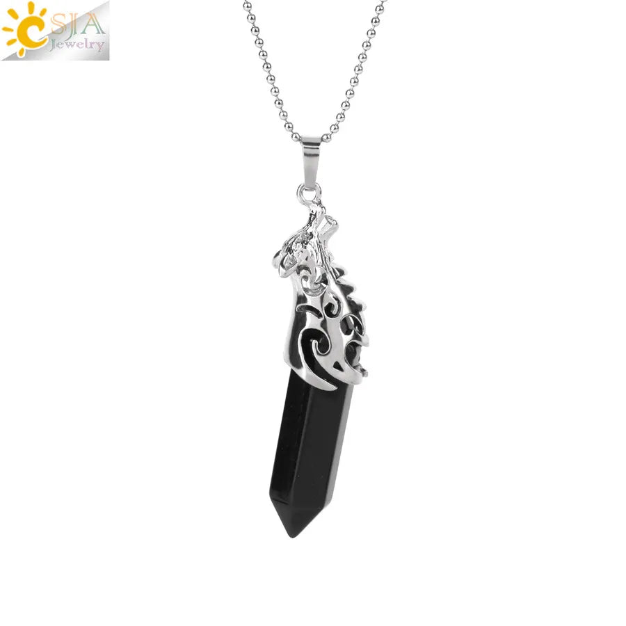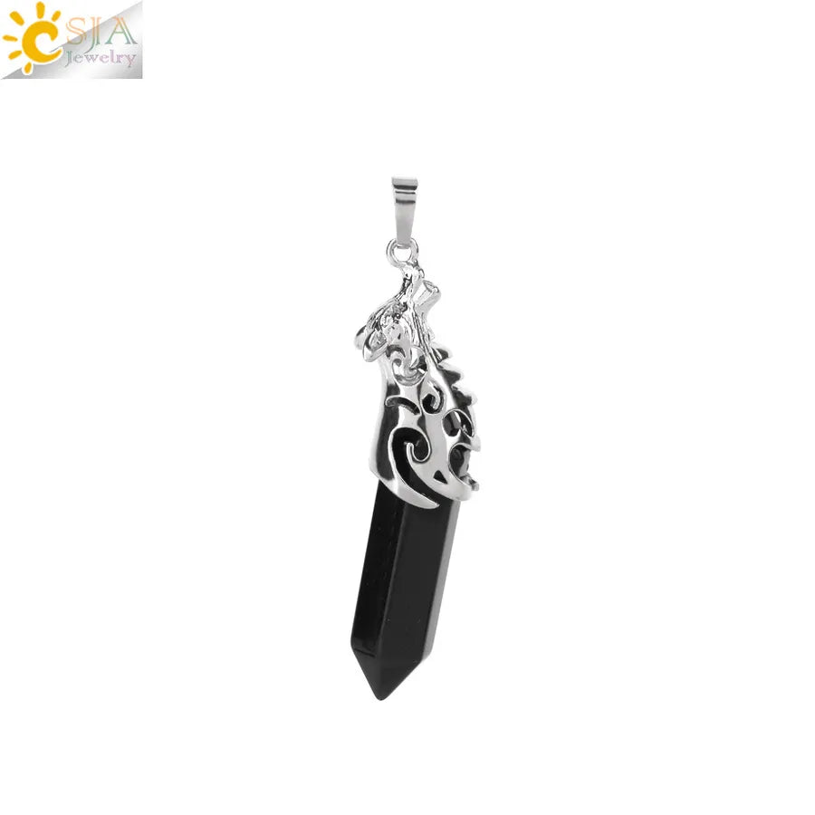 Natural Crystal Wolf Head Pendant Necklace Hexagonal Column Tiger Eye Obsidian Jewelry Unisex Simple Geometric Design - Obsidian H102-Obsidian
