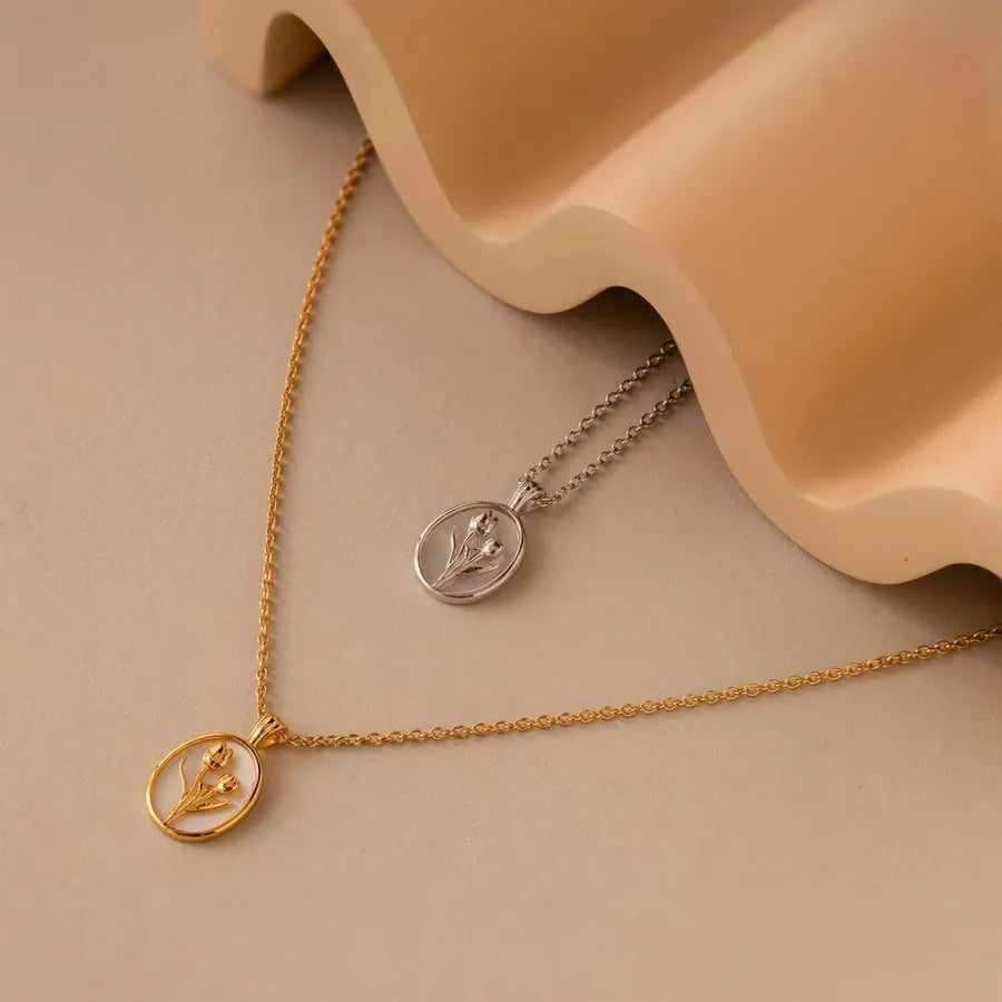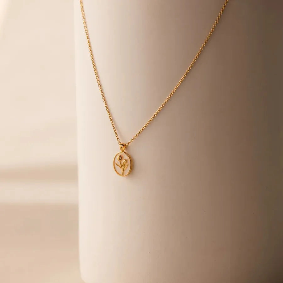 Retro Tulip Necklace Floral Oval Shell Pendant Clavicle Chain Jewelry Sweet Style Alloy Bohemian Print - Gold