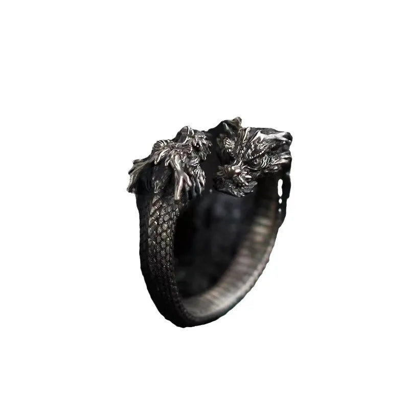 Retro Double Headed Dragon Ring Adjustable Silver Zinc Alloy Geometric Pattern Men's Fashionable Ethnic Style Jewelry Accessory - Adjustable Opening / Two-Headed Dragon Ring
